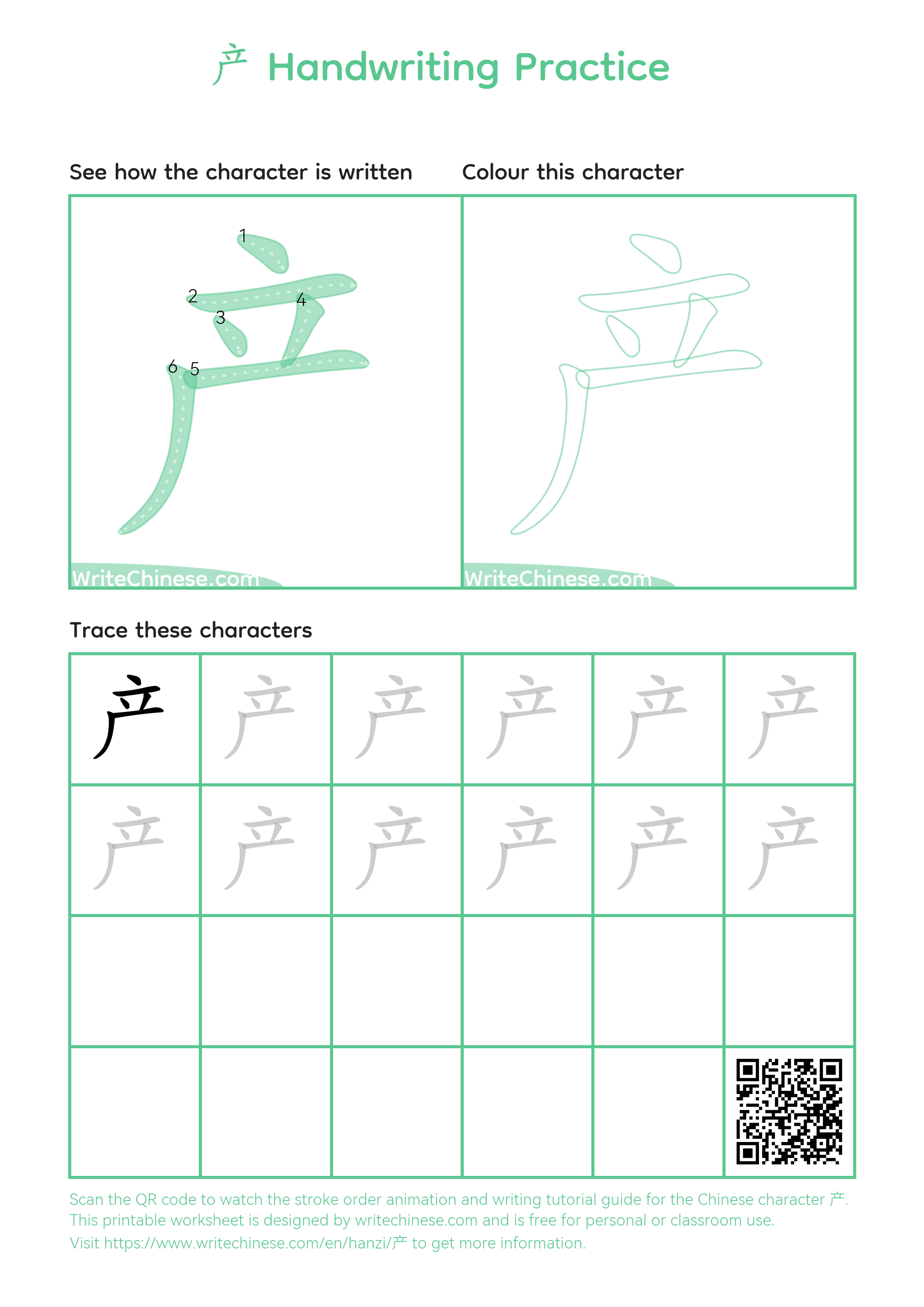 Chinese Character '产'. You can download the printable handwriting worksheets below and