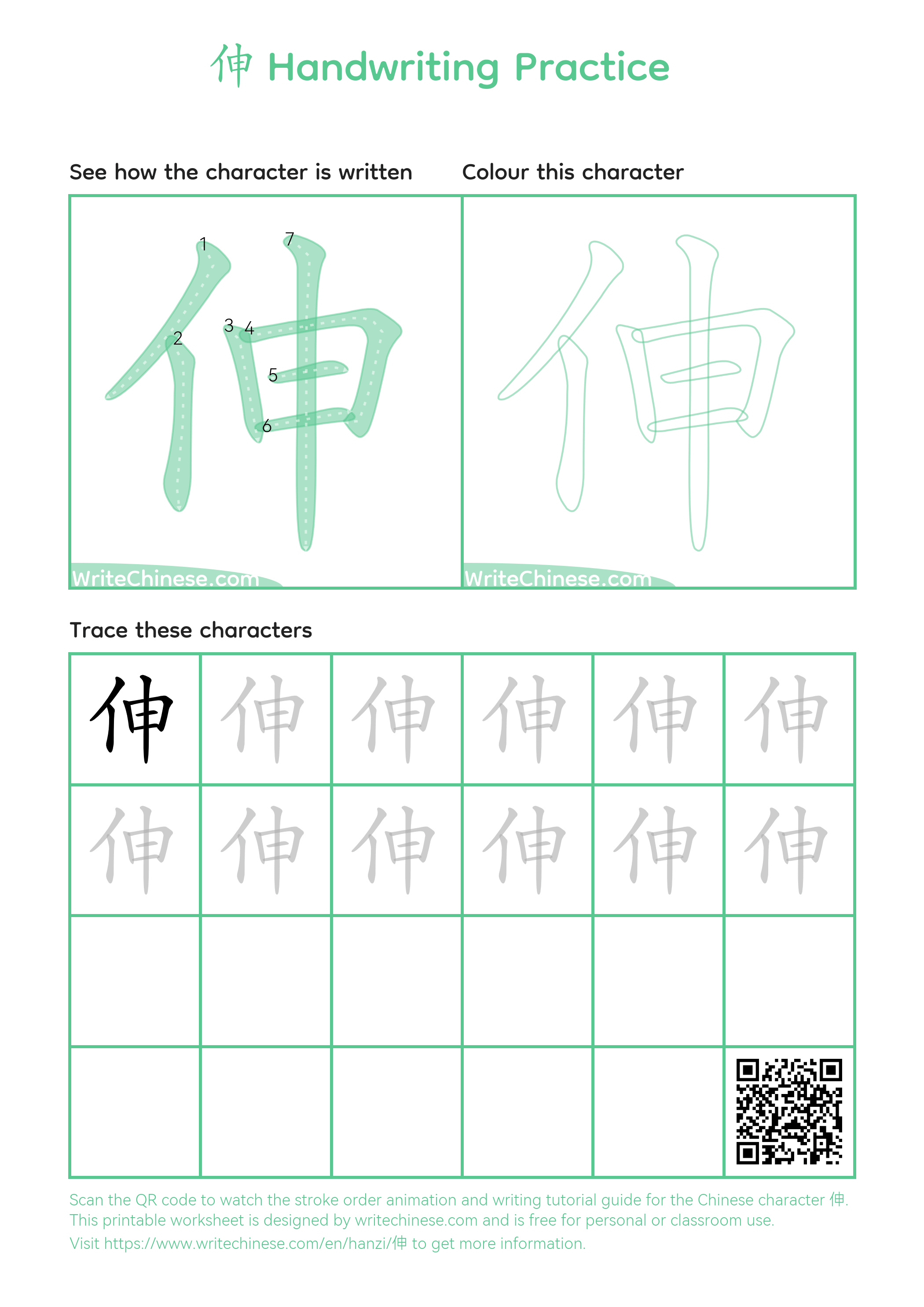 Chinese Character '伸'. You can download the printable handwriting worksheets below and