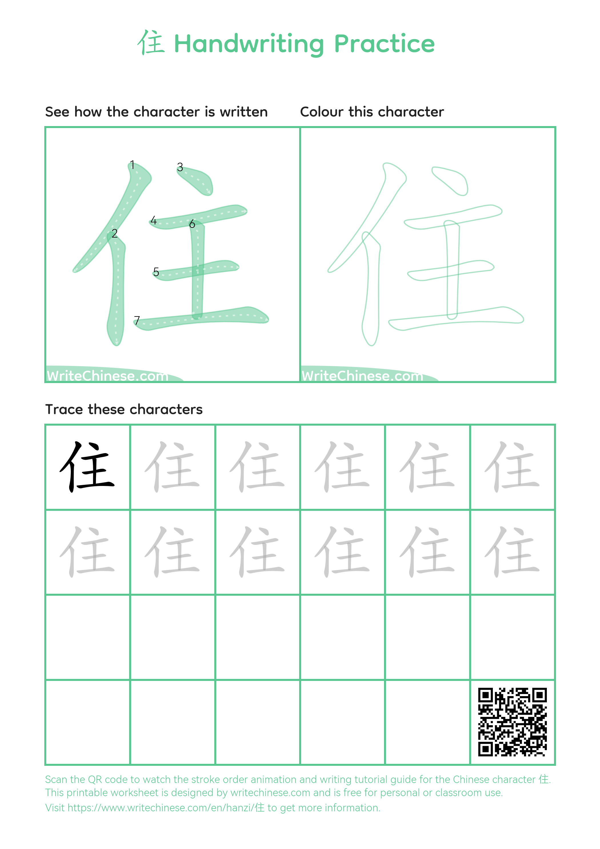 Chinese Character '住'. You can download the printable handwriting worksheets below and