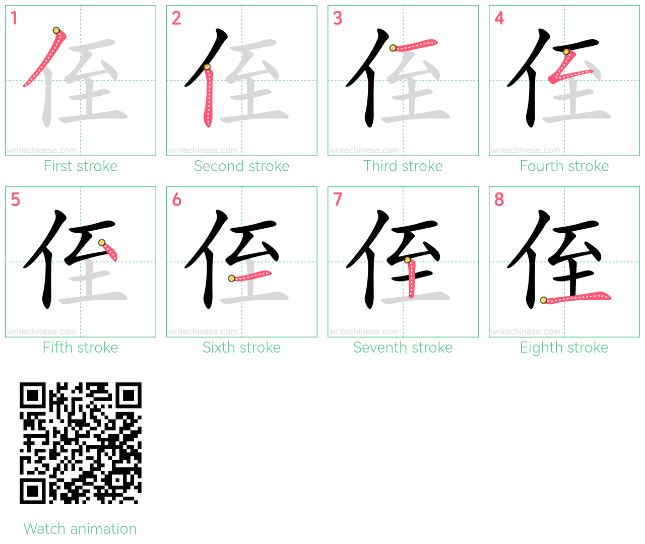 Master the Chinese character '侄' stroke by stroke with visual step-by-step instructions.
