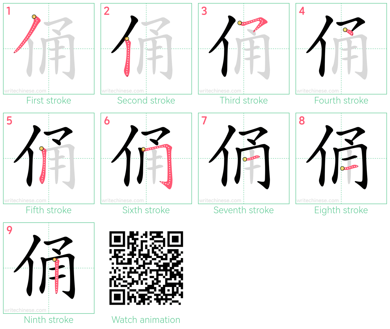 Master the Chinese character '俑' stroke by stroke with visual step-by-step instructions.