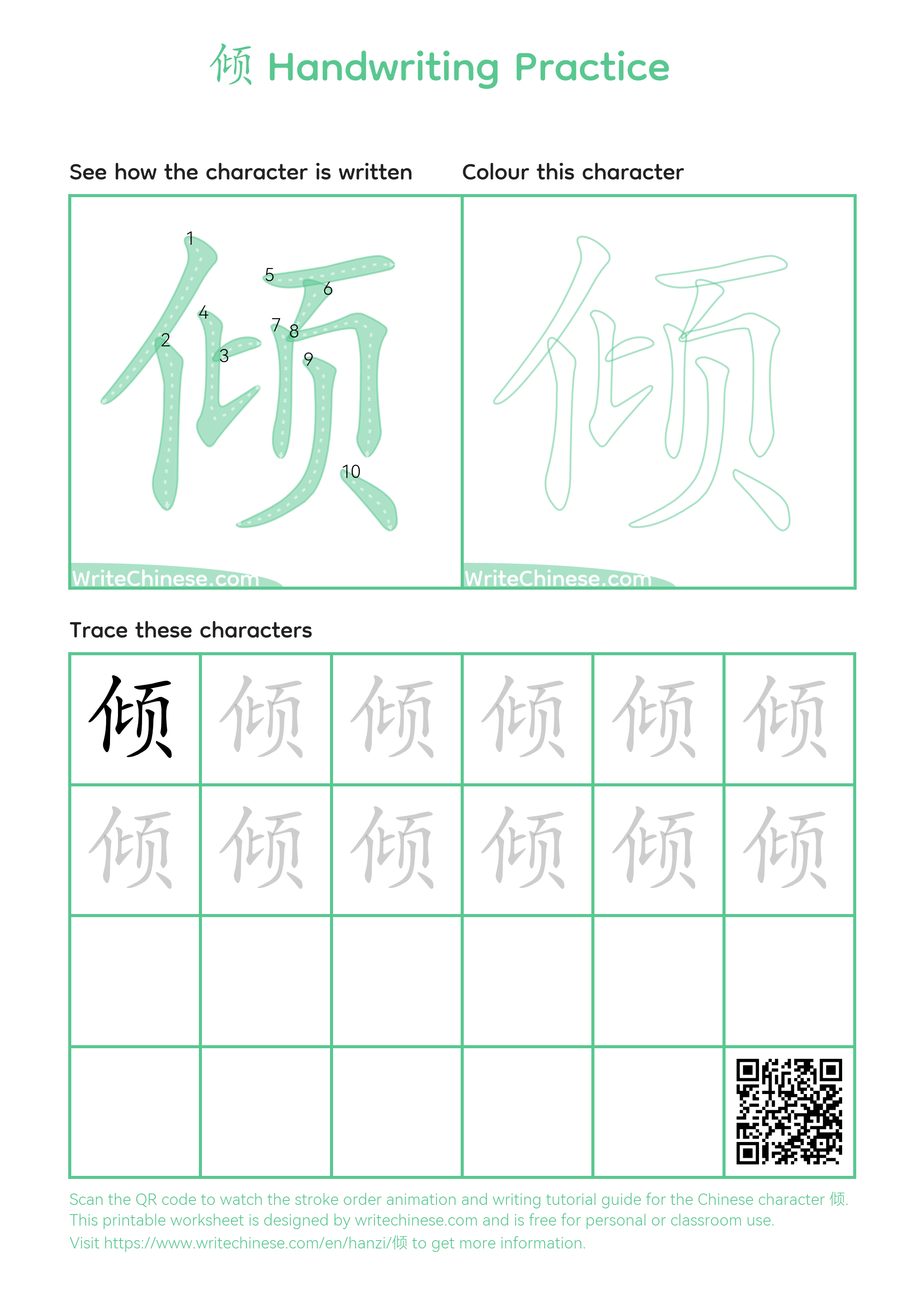 Chinese Character '倾'. You can download the printable handwriting worksheets below and