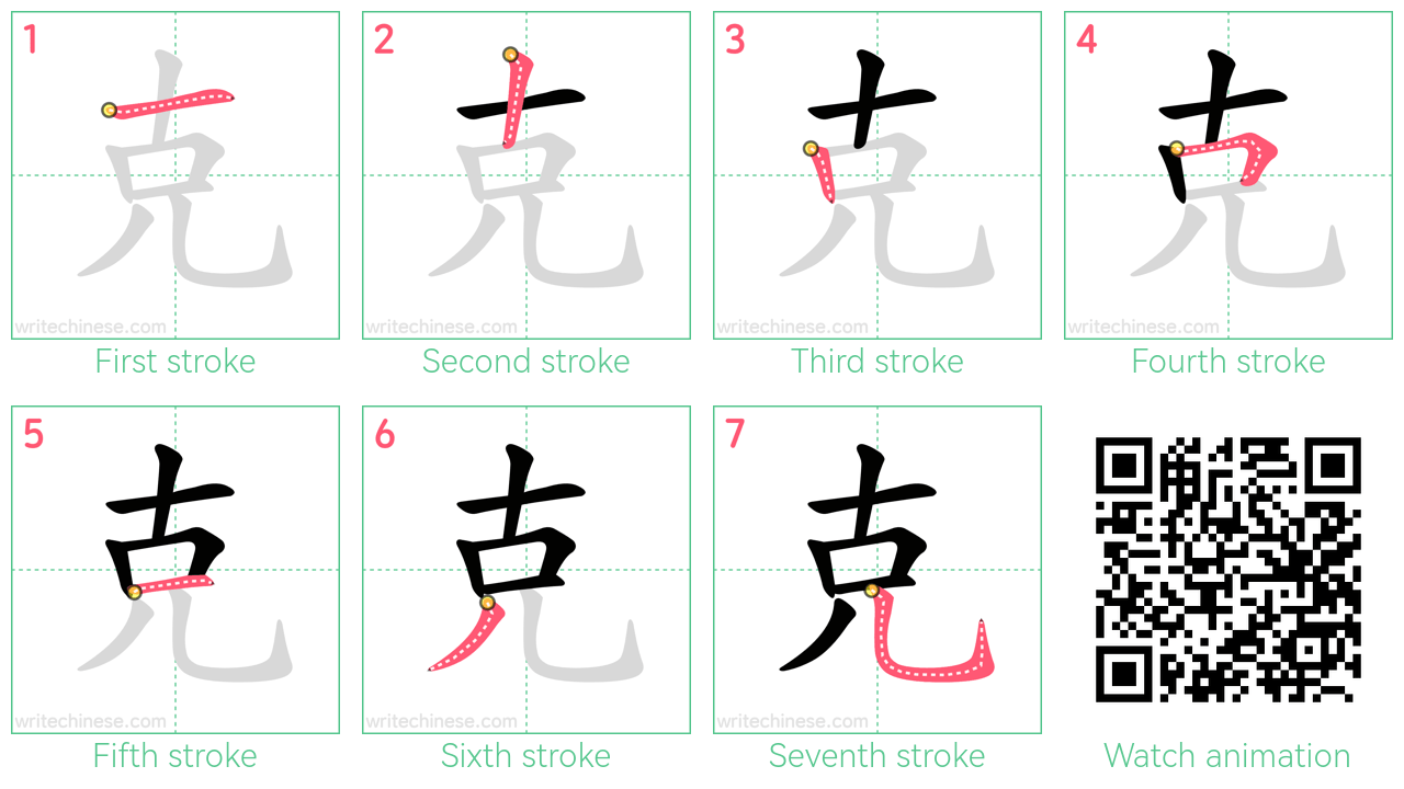 Master the Chinese character '克' stroke by stroke with visual step-by-step instructions.