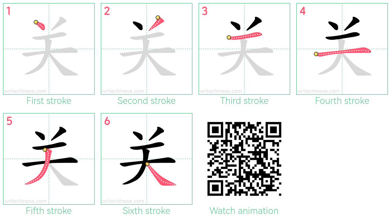 Master the Chinese character '关 ' stroke by stroke with visual step-by-step instructions.