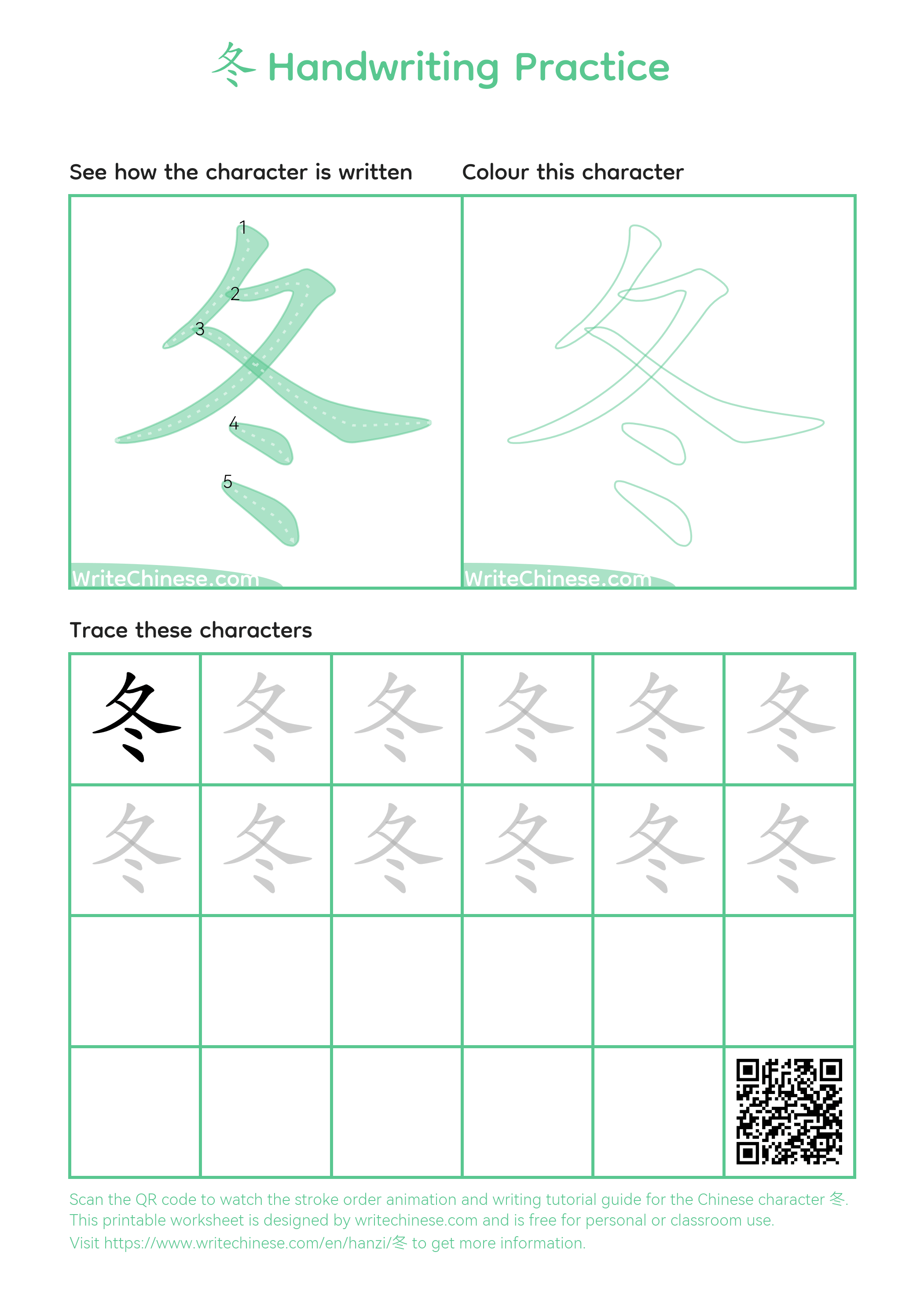 Chinese Character '冬'. You can download the printable handwriting worksheets below and
