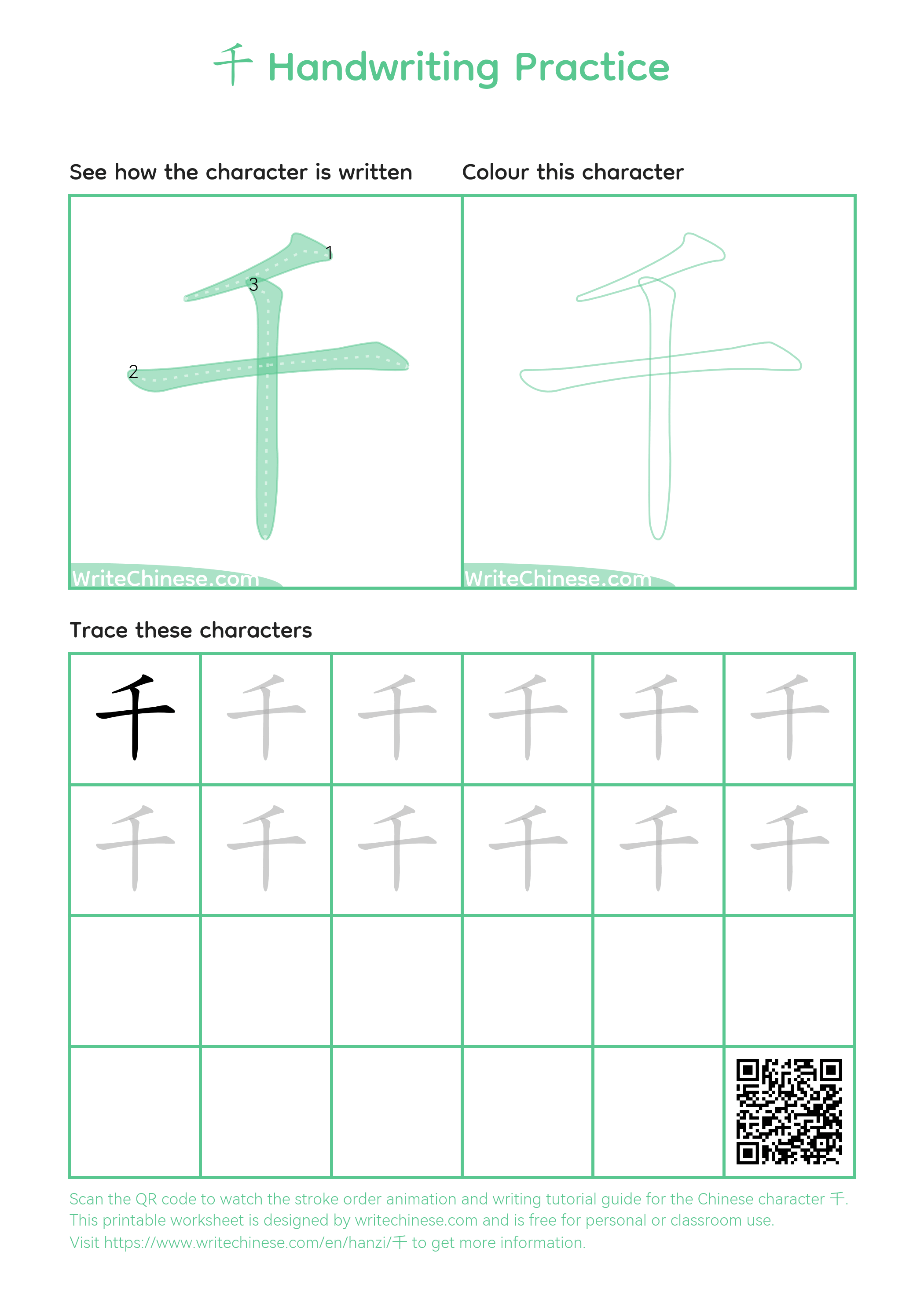 Chinese Character '千'. You can download the printable handwriting worksheets below and
