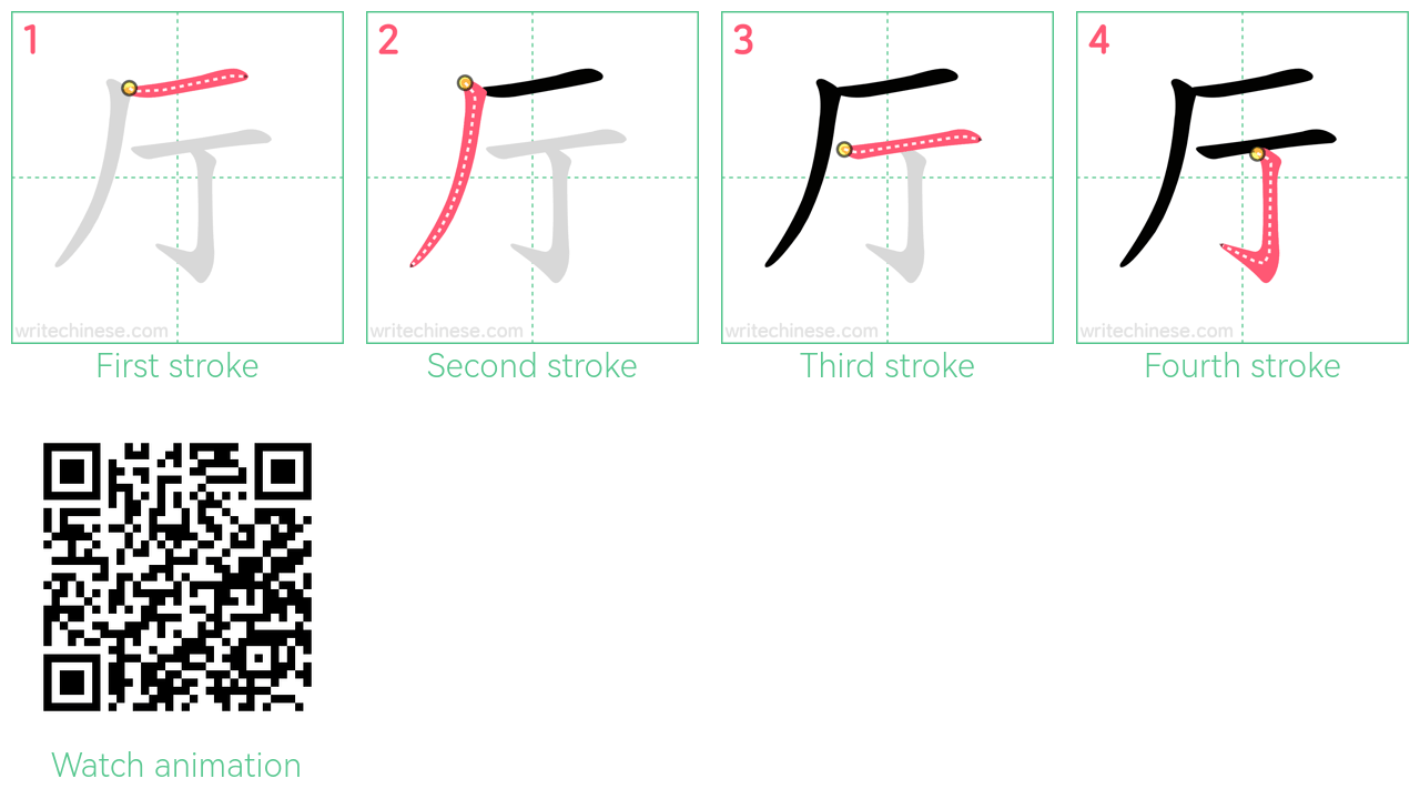 Learn to write the Chinese character "厅" by watching the stroke order animation of "厅".