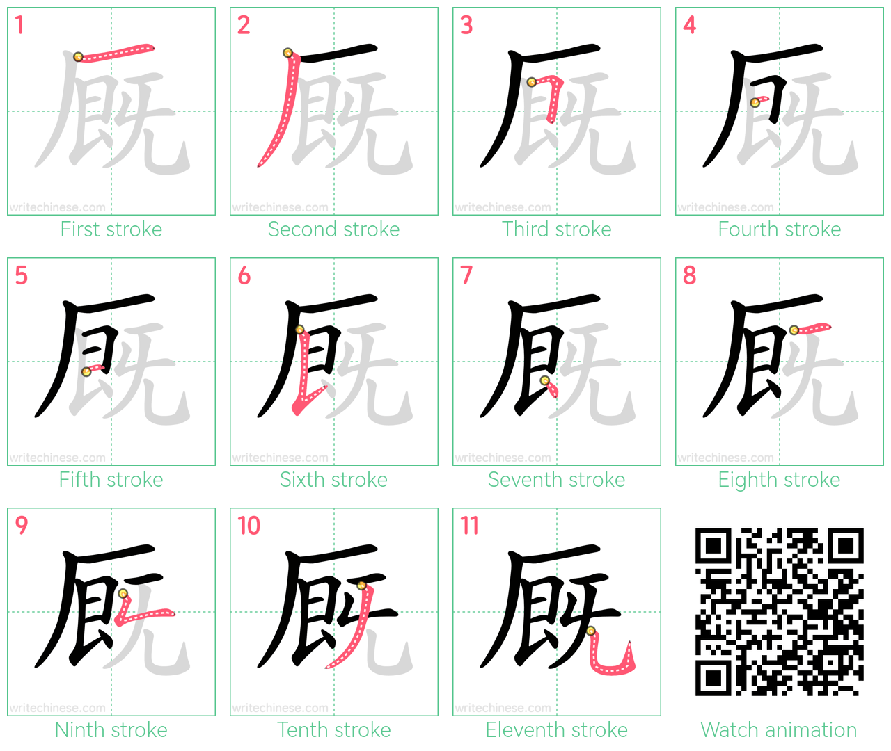 Master the Chinese character '厩' stroke by stroke with visual step-by-step instructions.