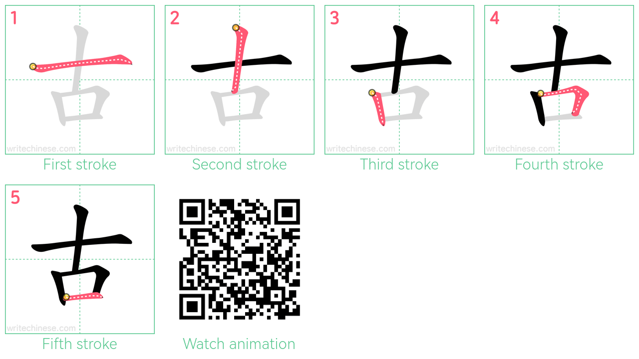 Learn to write the Chinese character "古" by watching the stroke order animation of "古".