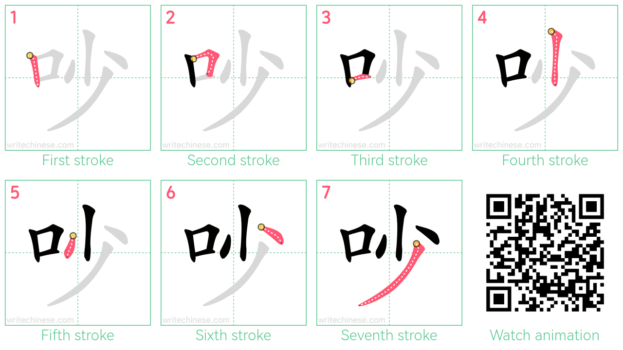 Master the Chinese character '吵' stroke by stroke with visual step-by-step instructions.
