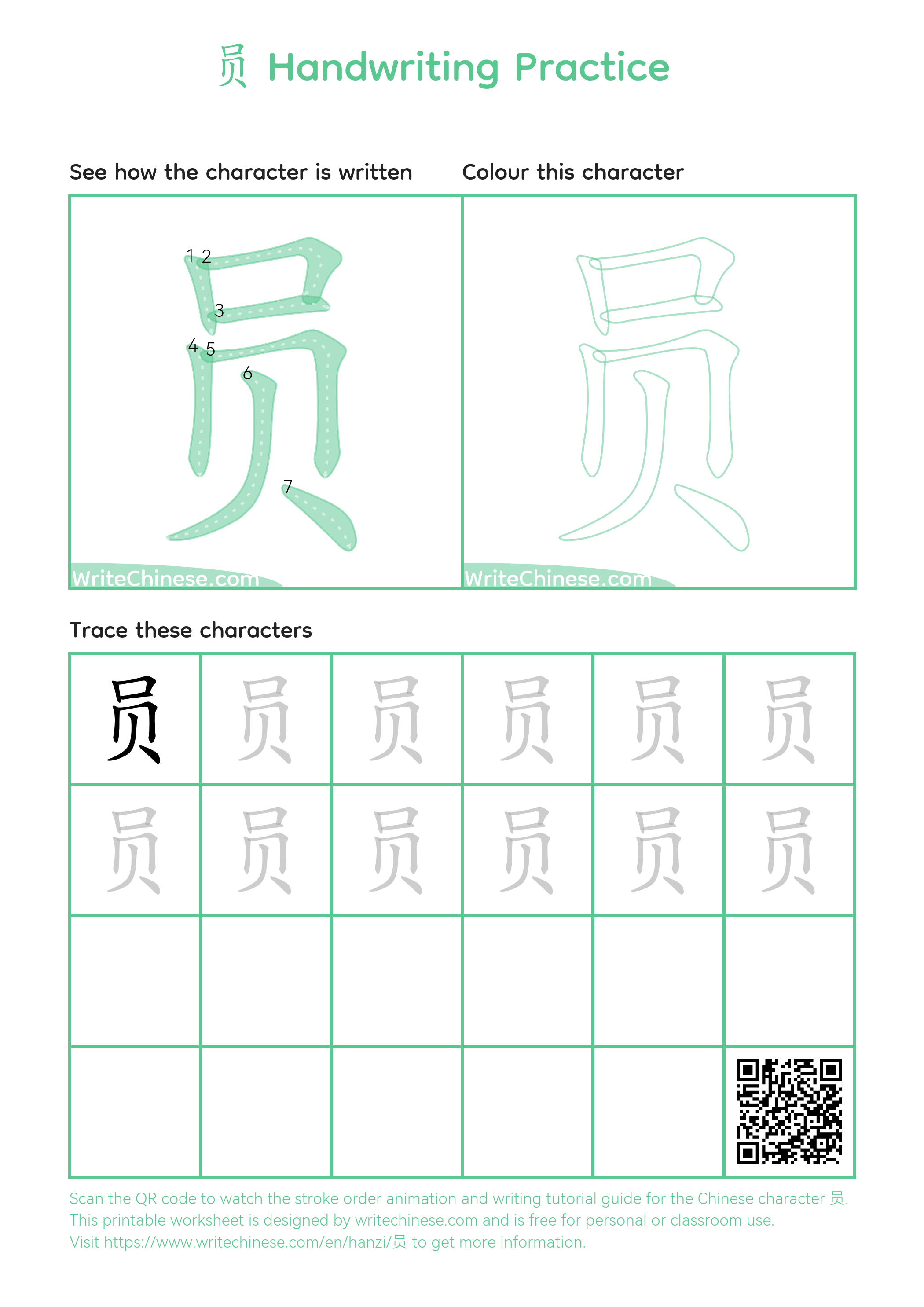 Chinese Character '员'. You can download the printable handwriting worksheets below and