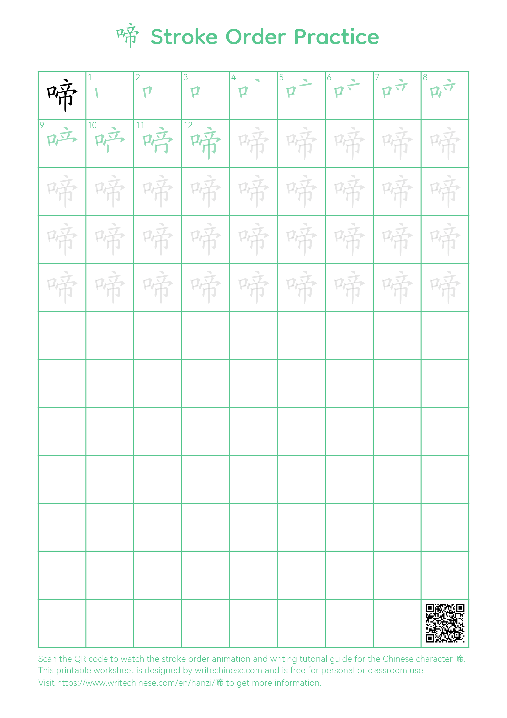 Chinese Character '啼'. You can download the printable handwriting worksheets below and