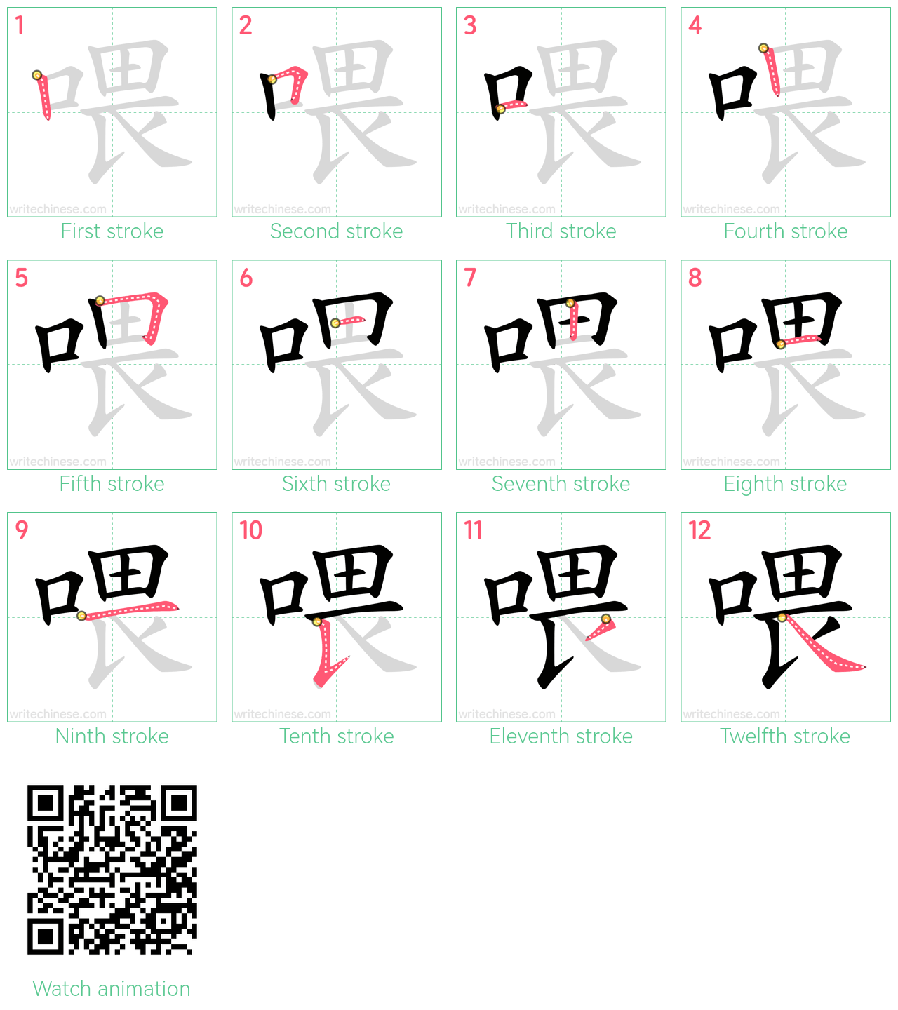 Master the Chinese character '喂' stroke by stroke with visual step-by-step instructions.