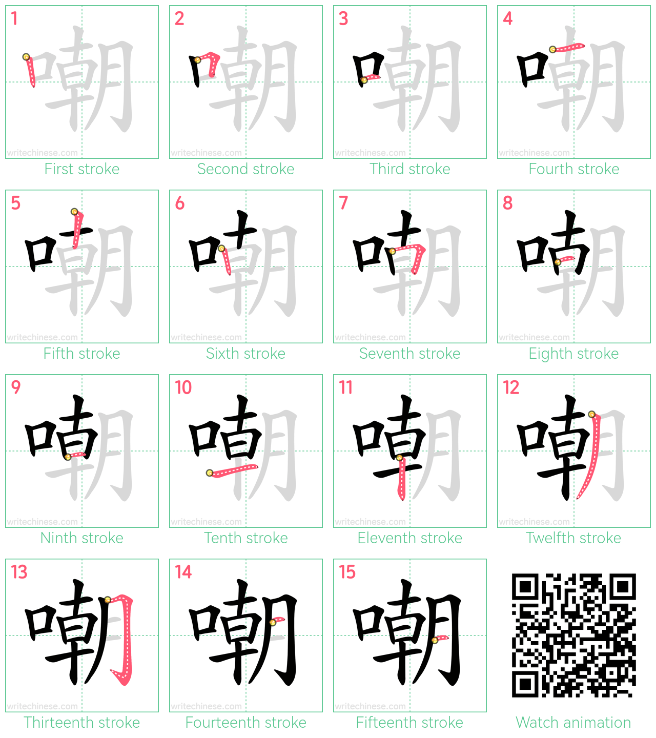 Master the Chinese character '嘲' stroke by stroke with visual step-by-step instructions.