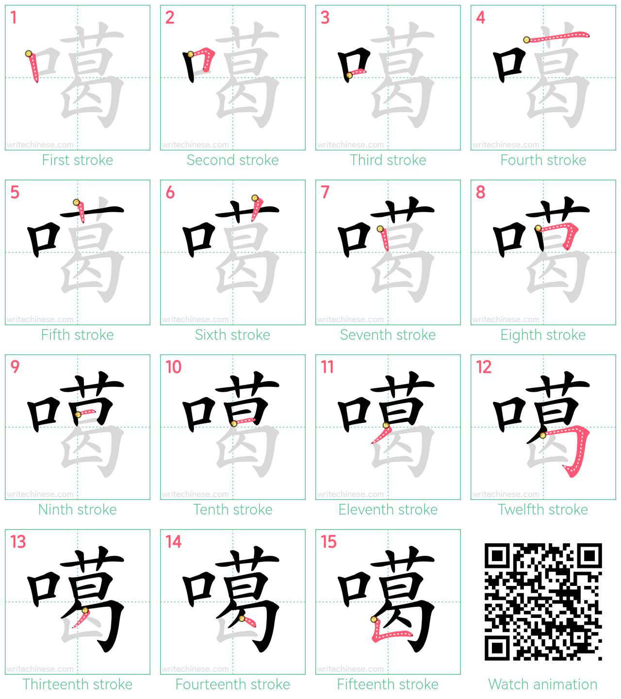 Master the Chinese character '噶' stroke by stroke with visual step-by-step instructions.