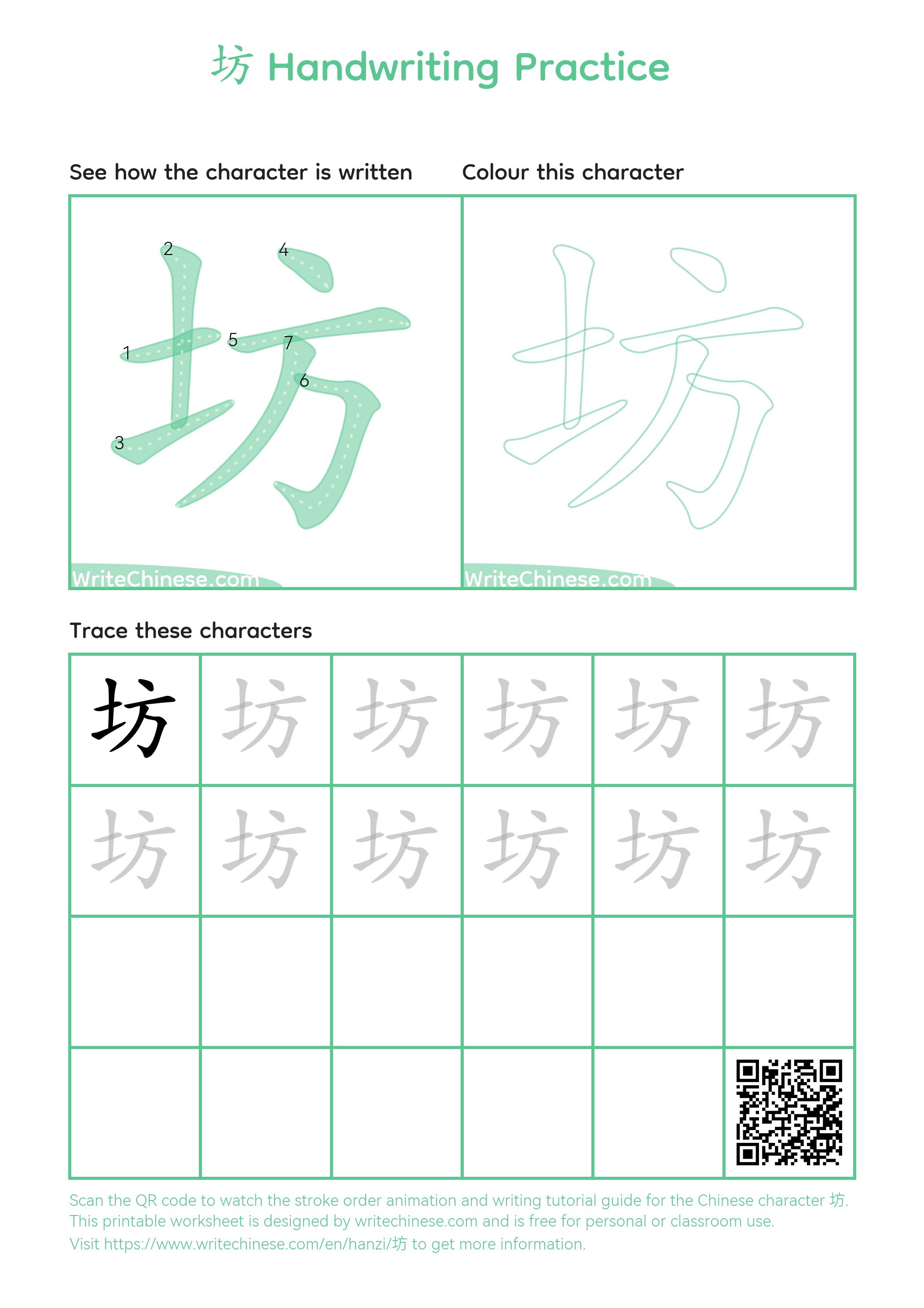 Chinese Character '坊'. You can download the printable handwriting worksheets below and