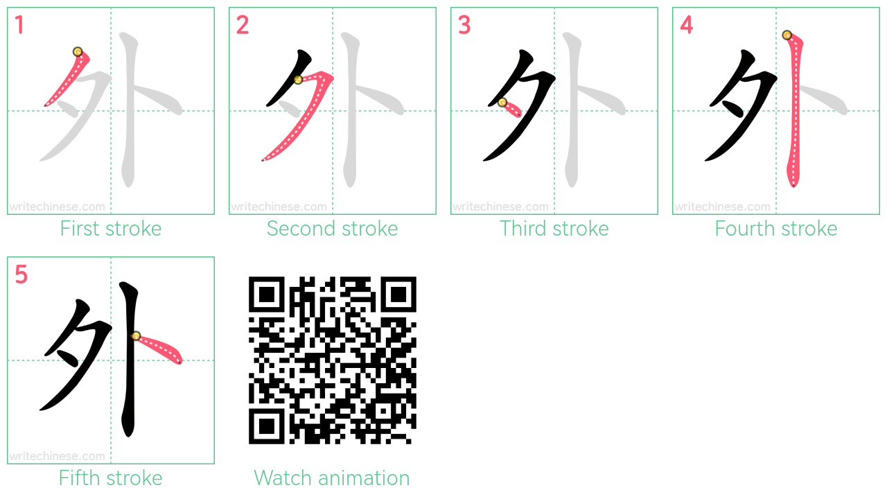 Learn to write the Chinese character "外" by watching the stroke order animation of "外".