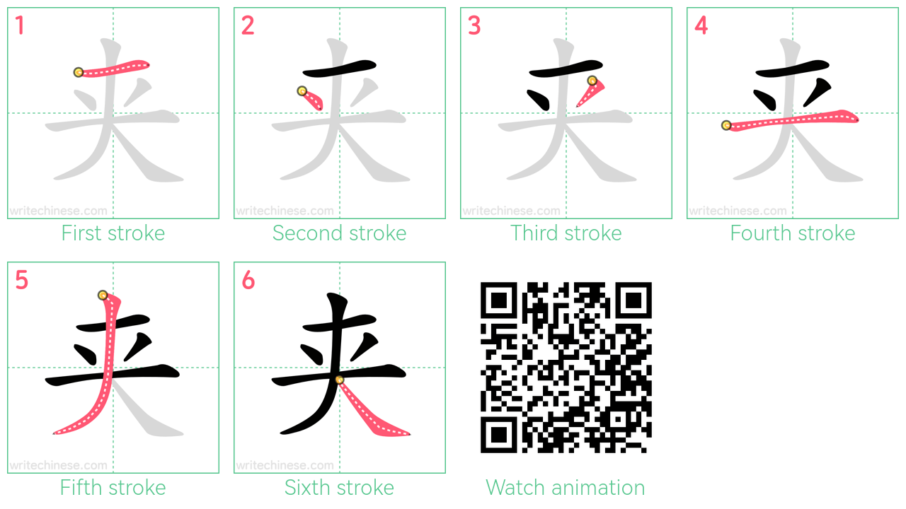 Master the Chinese character '夹' stroke by stroke with visual step-by-step instructions.