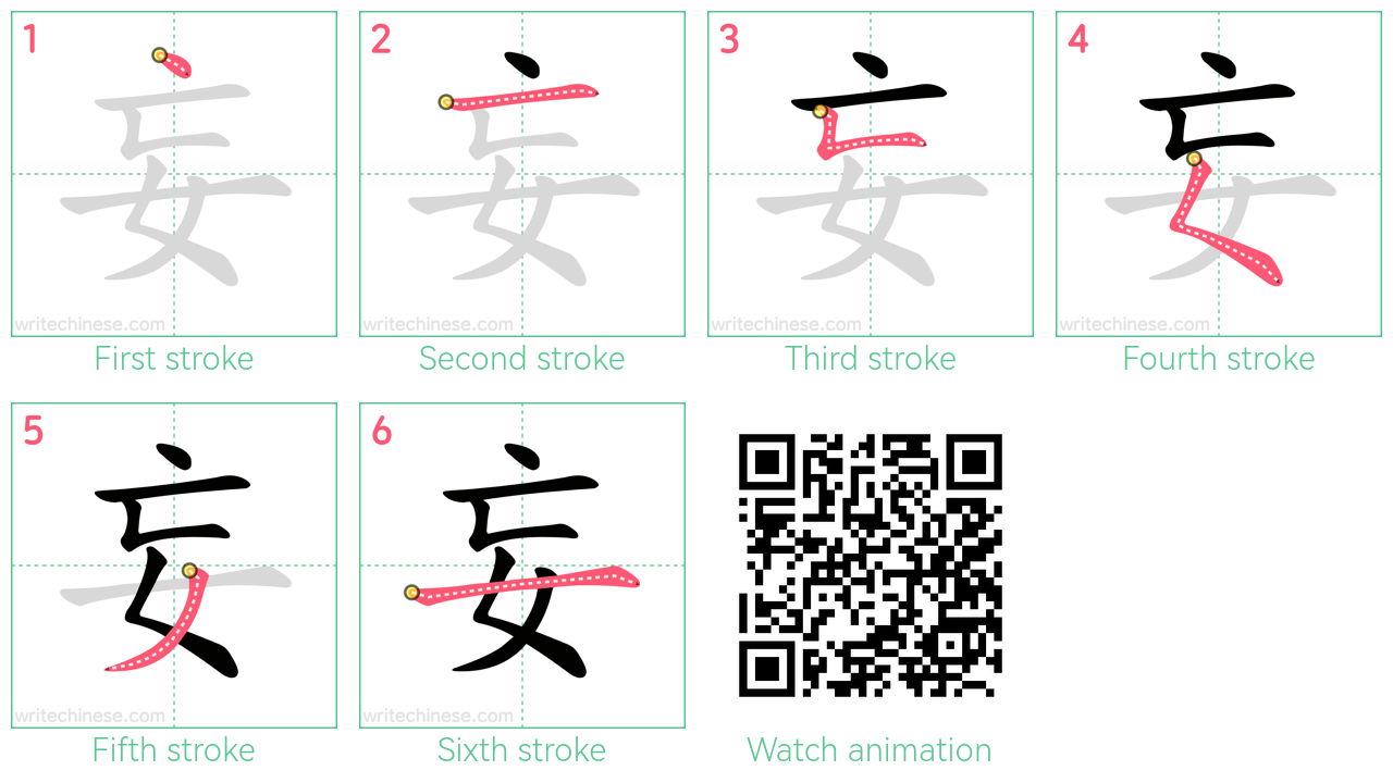 Master the Chinese character '妄 ' stroke by stroke with visual step-by-step instructions.