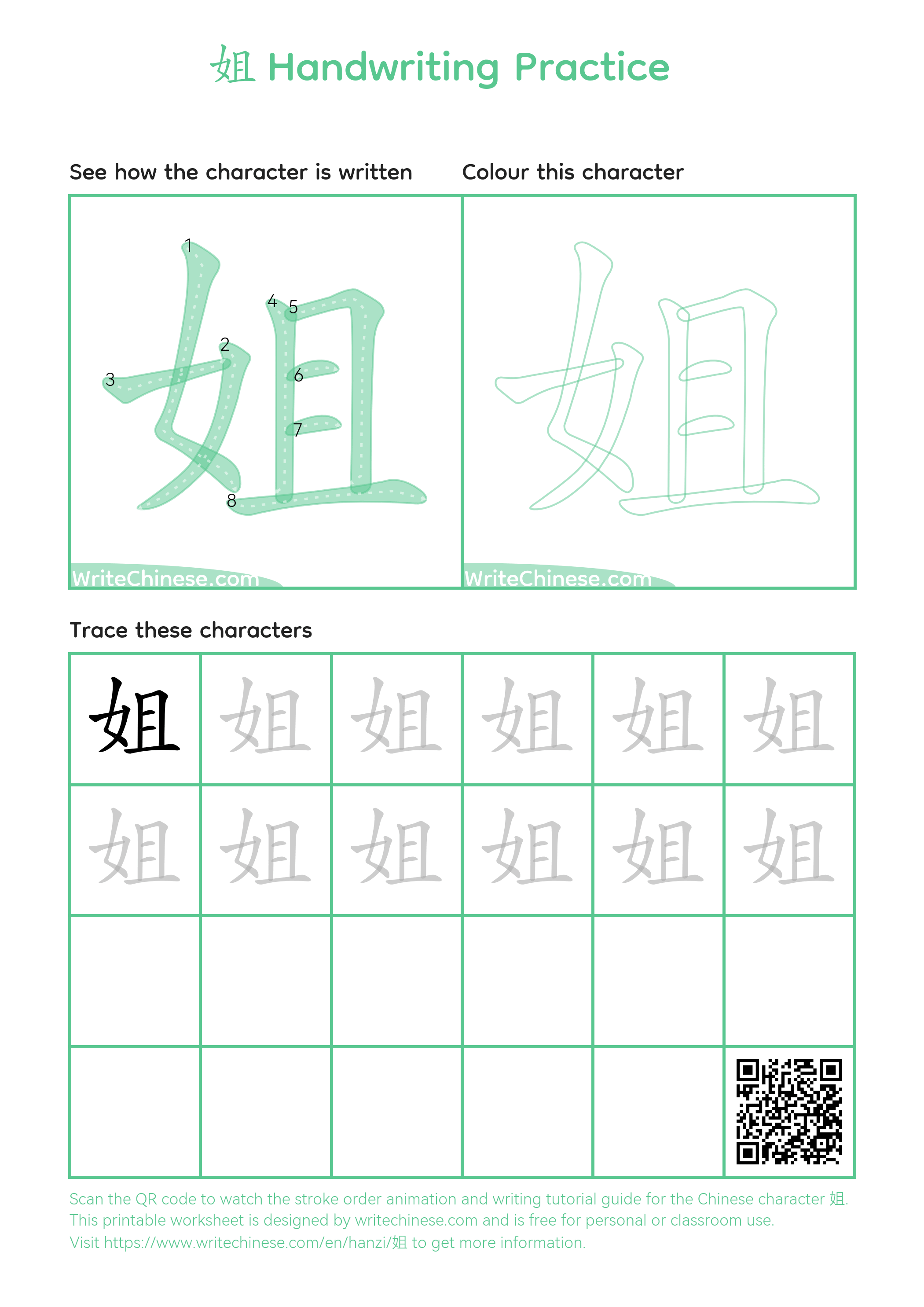 Chinese Character '姐'. You can download the printable handwriting worksheets below and