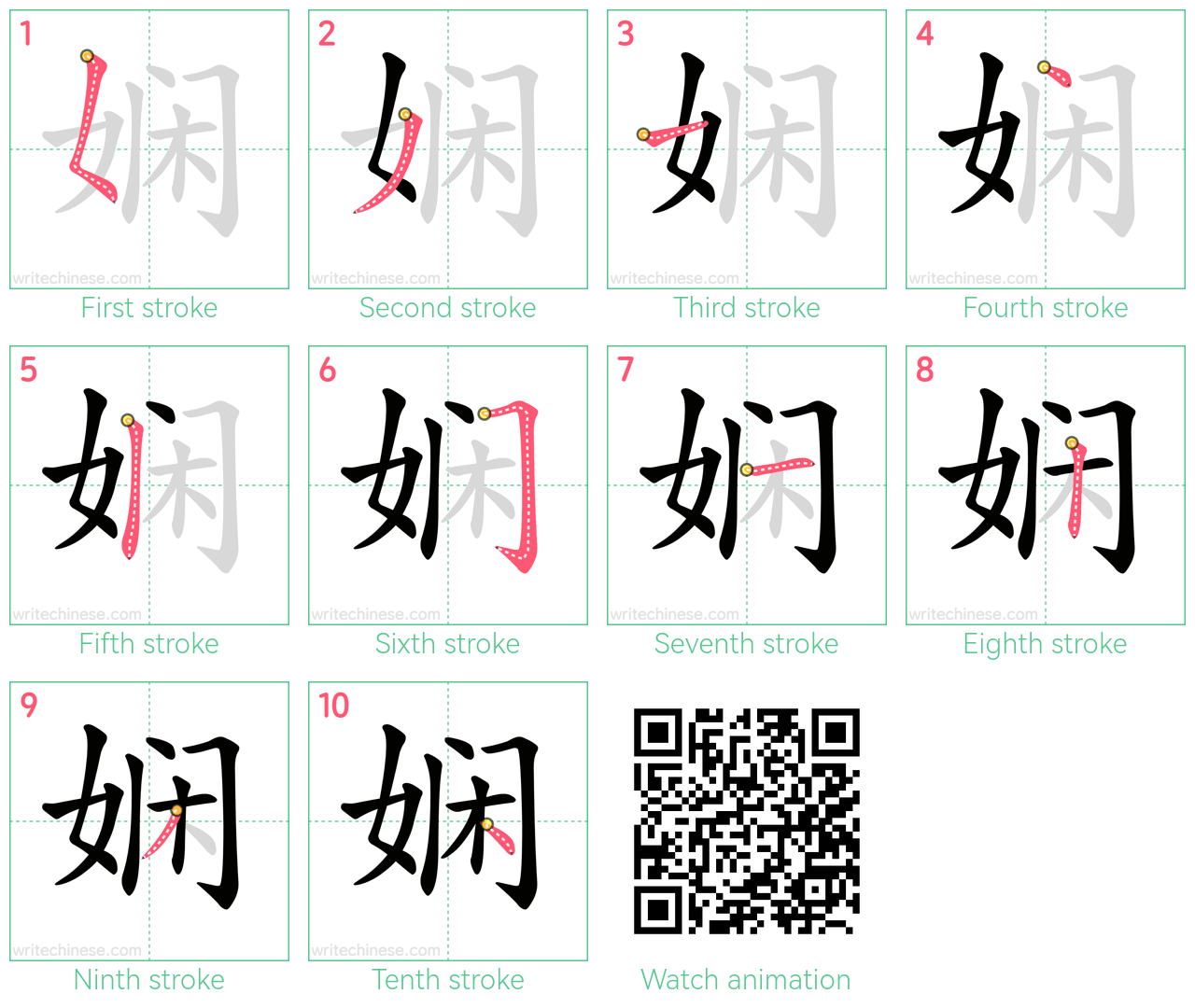 Printable Stroke Order Practice Worksheet of the Chinese character 娴
