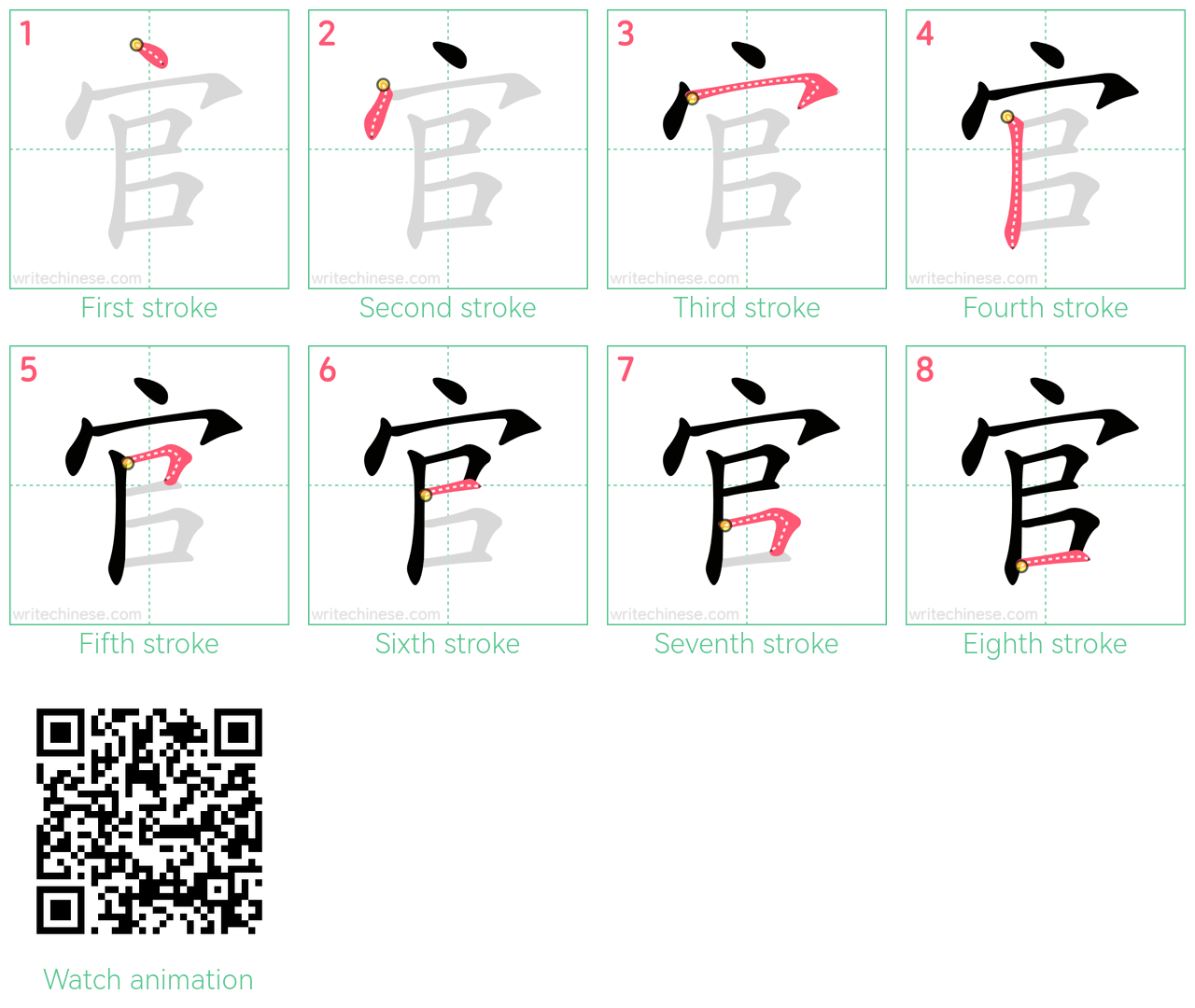 Master the Chinese character '官' stroke by stroke with visual step-by-step instructions.