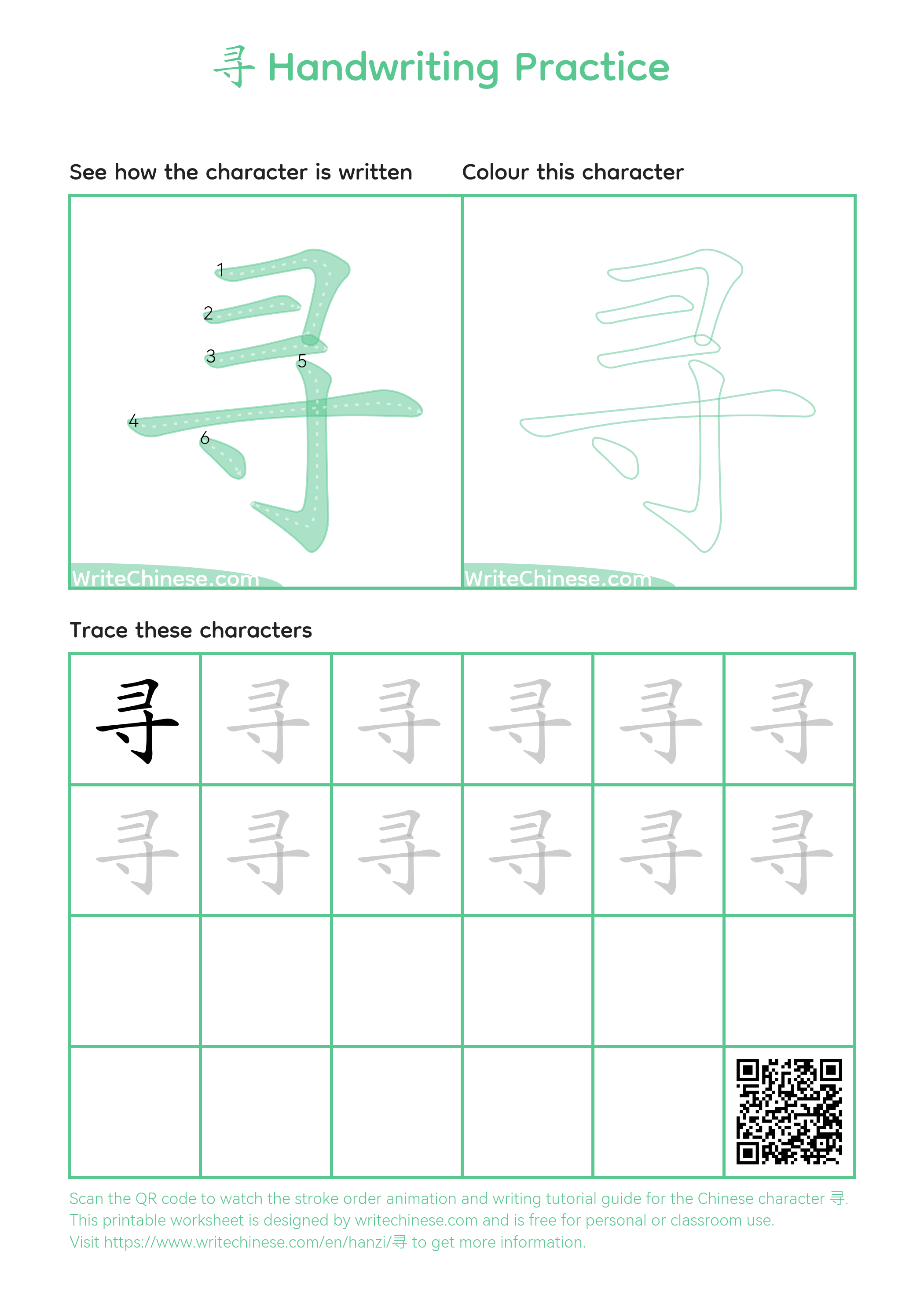 Printable Stroke Order Practice Worksheet of the Chinese character 寻