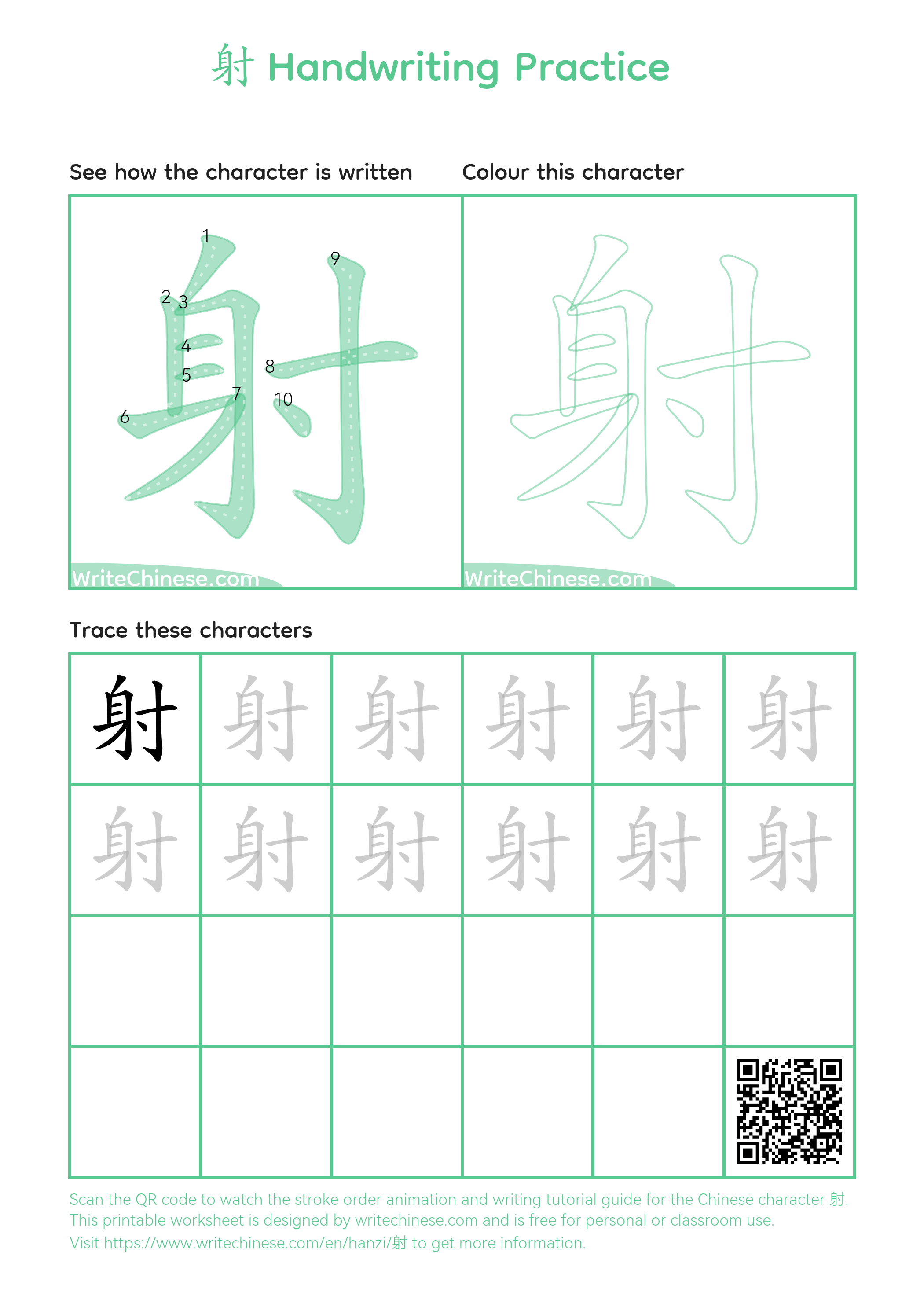 Chinese Character '射'. You can download the printable handwriting worksheets below and