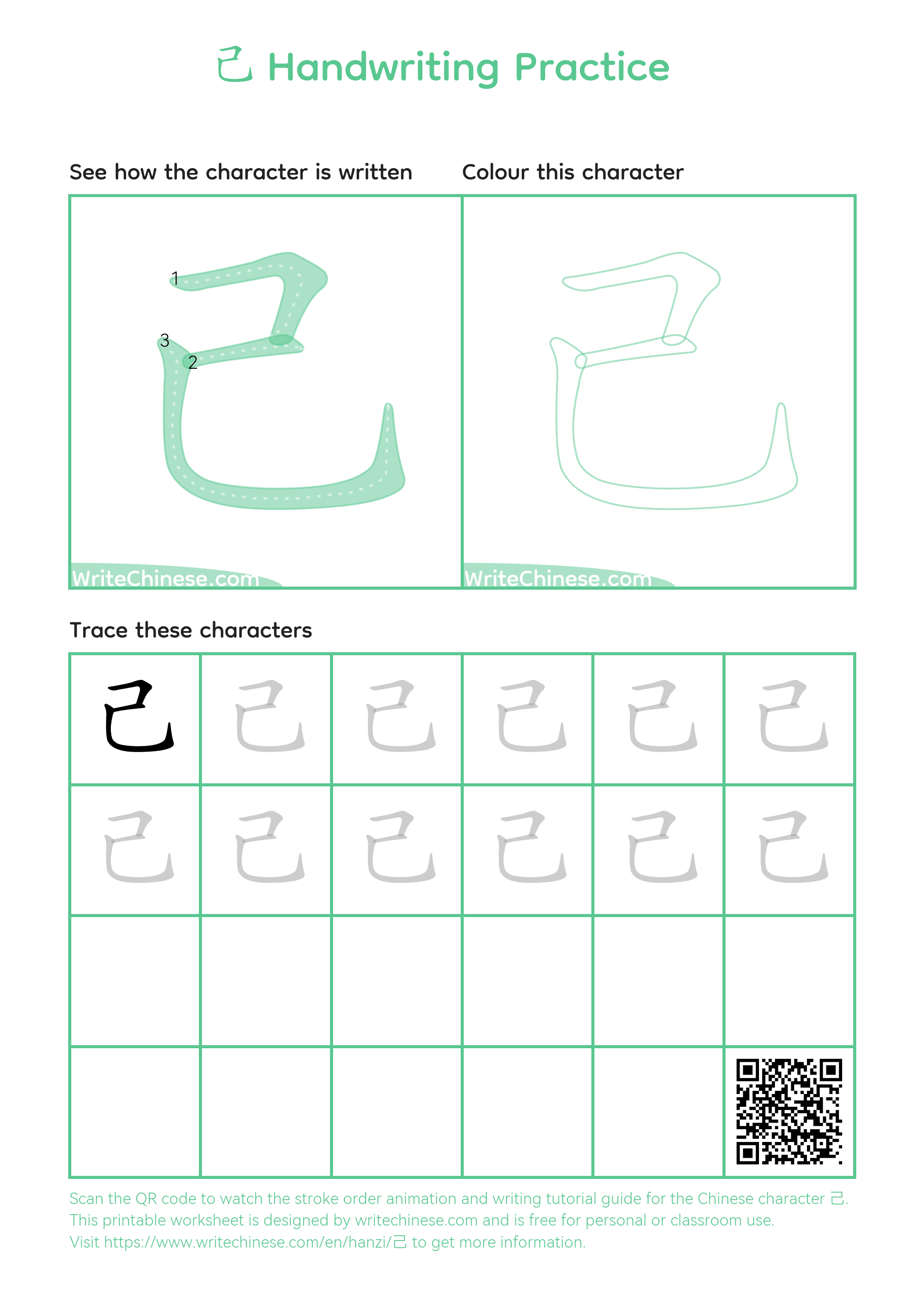 Chinese Character '己'. You can download the printable handwriting worksheets below and