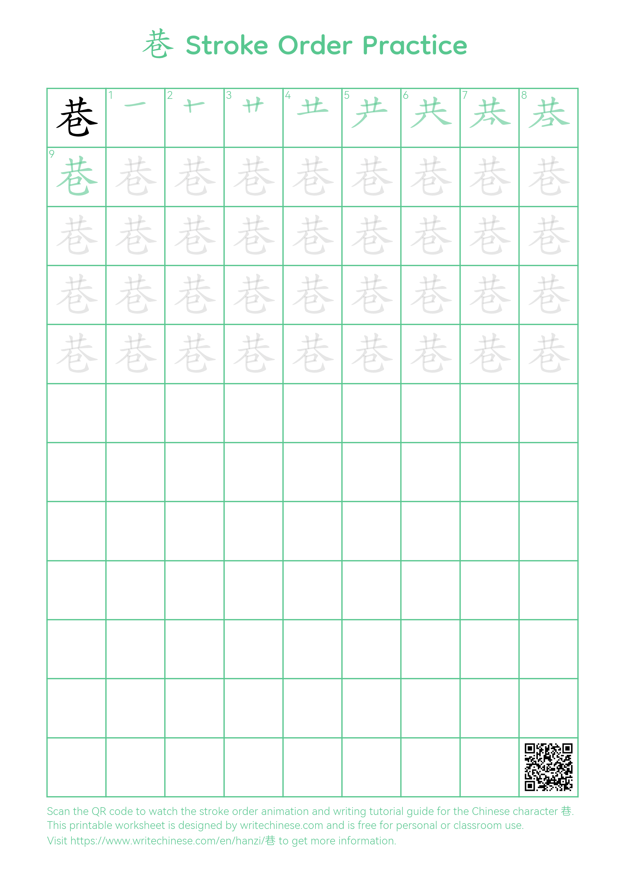 Chinese Character '巷'. You can download the printable handwriting worksheets below and