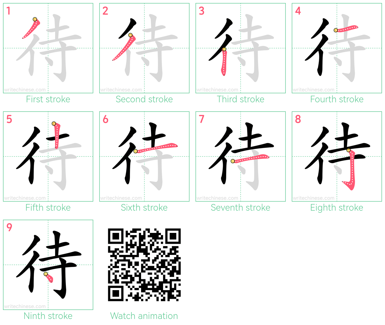 Master the Chinese character '待' stroke by stroke with visual step-by-step instructions.