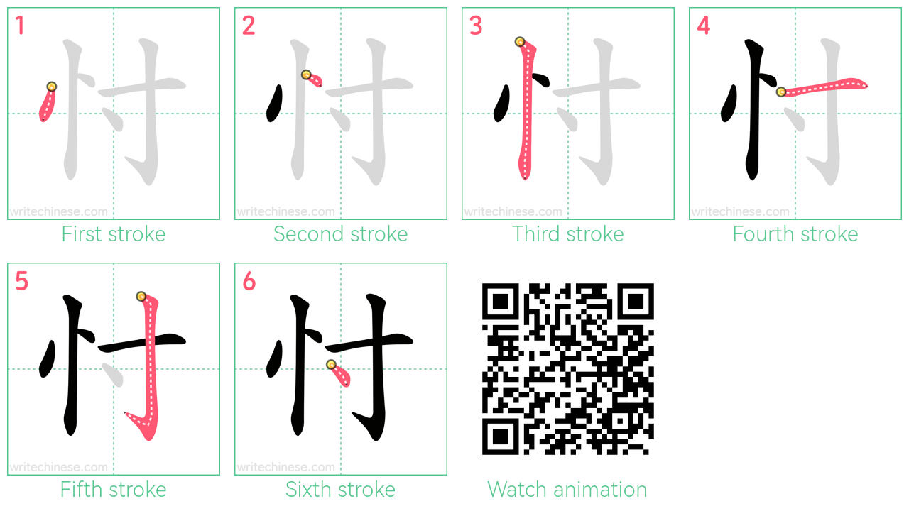 Learn to write the Chinese character "忖" by watching the stroke order animation of "忖".