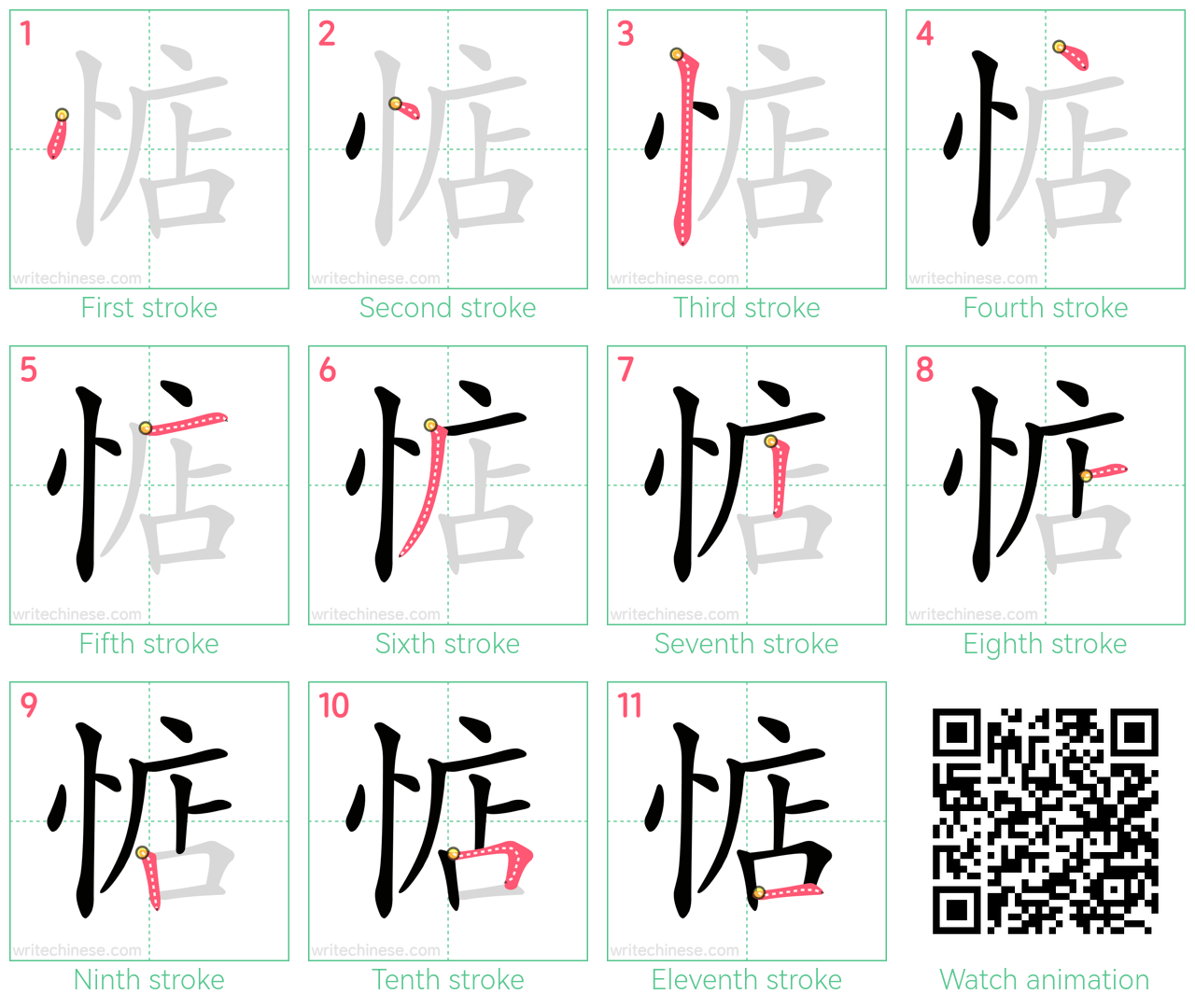 Master the Chinese character '惦' stroke by stroke with visual step-by-step instructions.