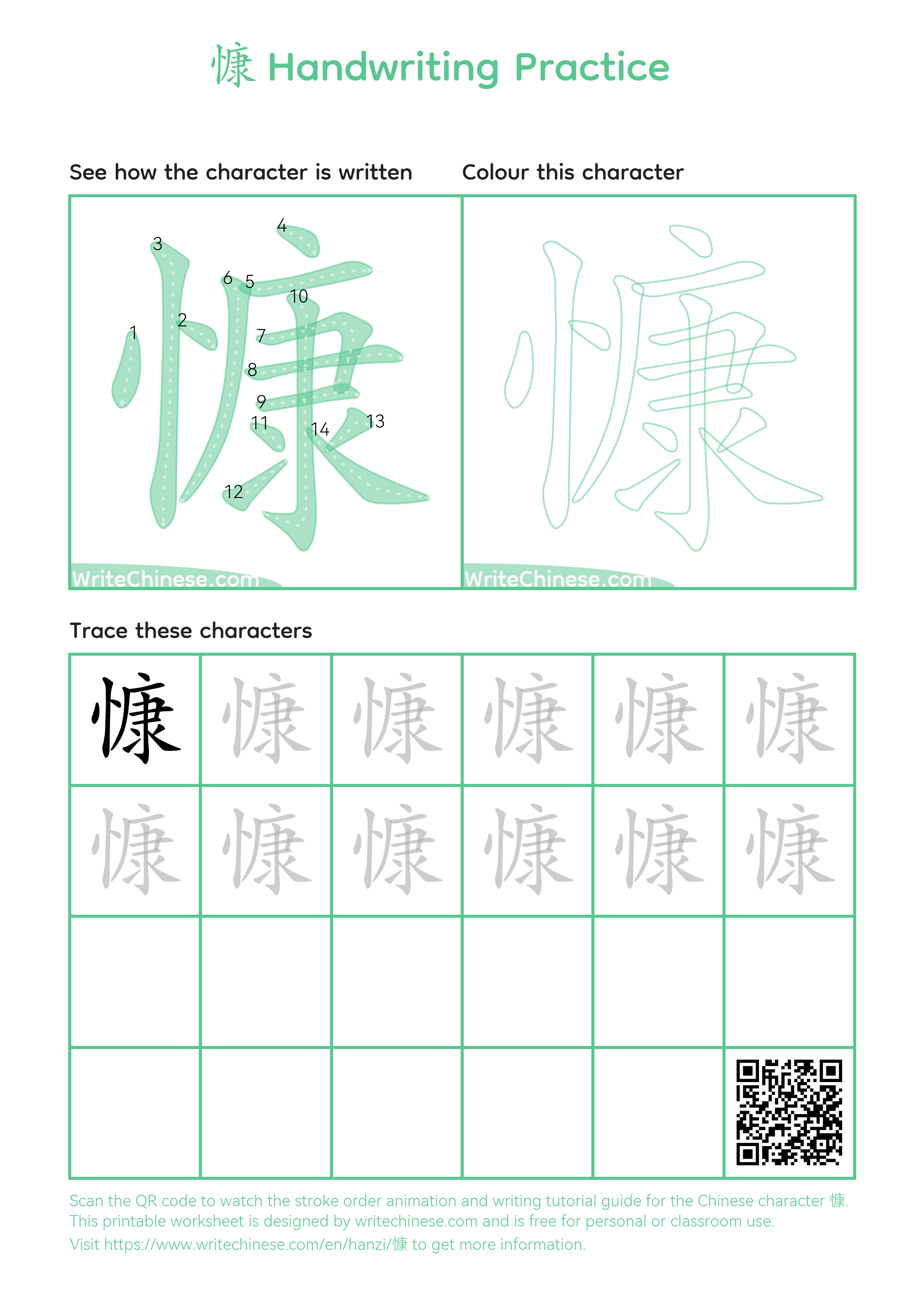 Chinese Character '慷'. You can download the printable handwriting worksheets below and