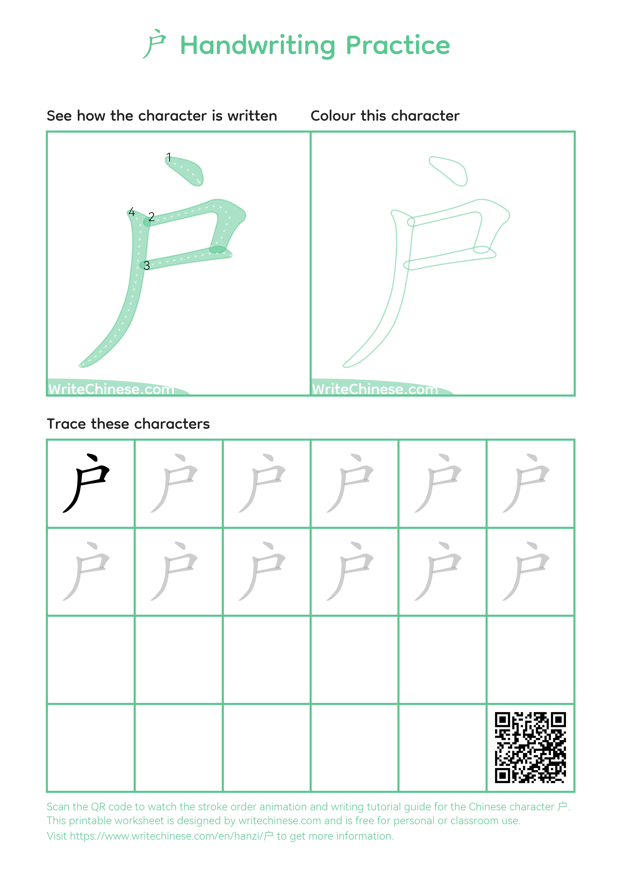 Chinese Character '户'. You can download the printable handwriting worksheets below and