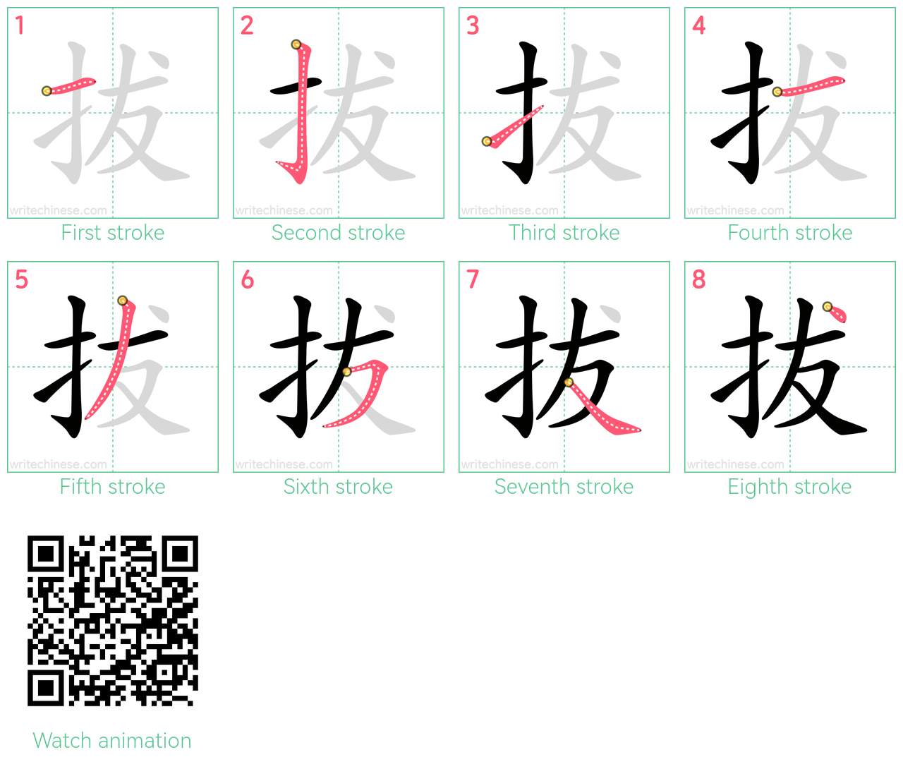 Master the Chinese character '拔' stroke by stroke with visual step-by-step instructions.