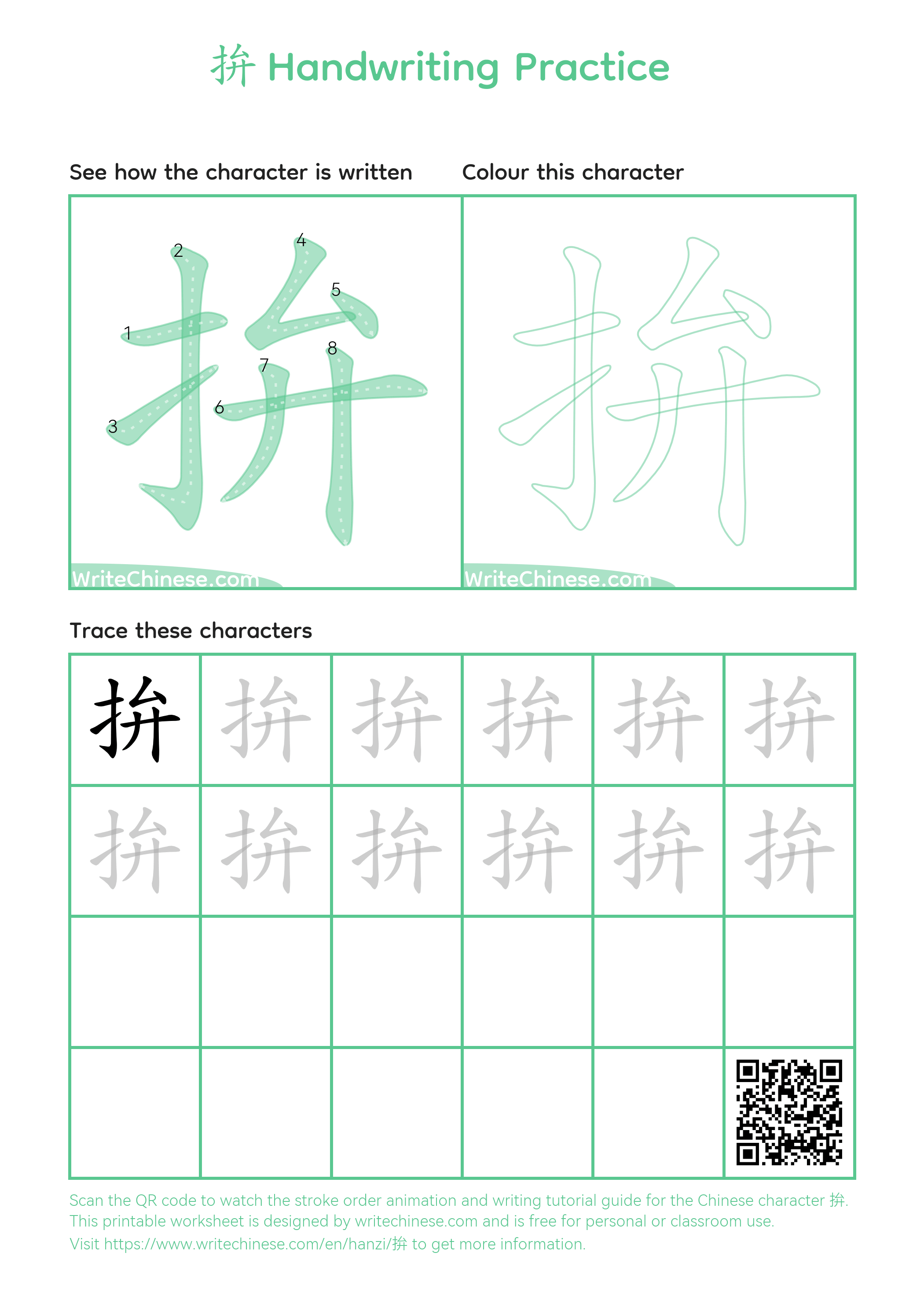 Chinese Character '拚'. You can download the printable handwriting worksheets below and