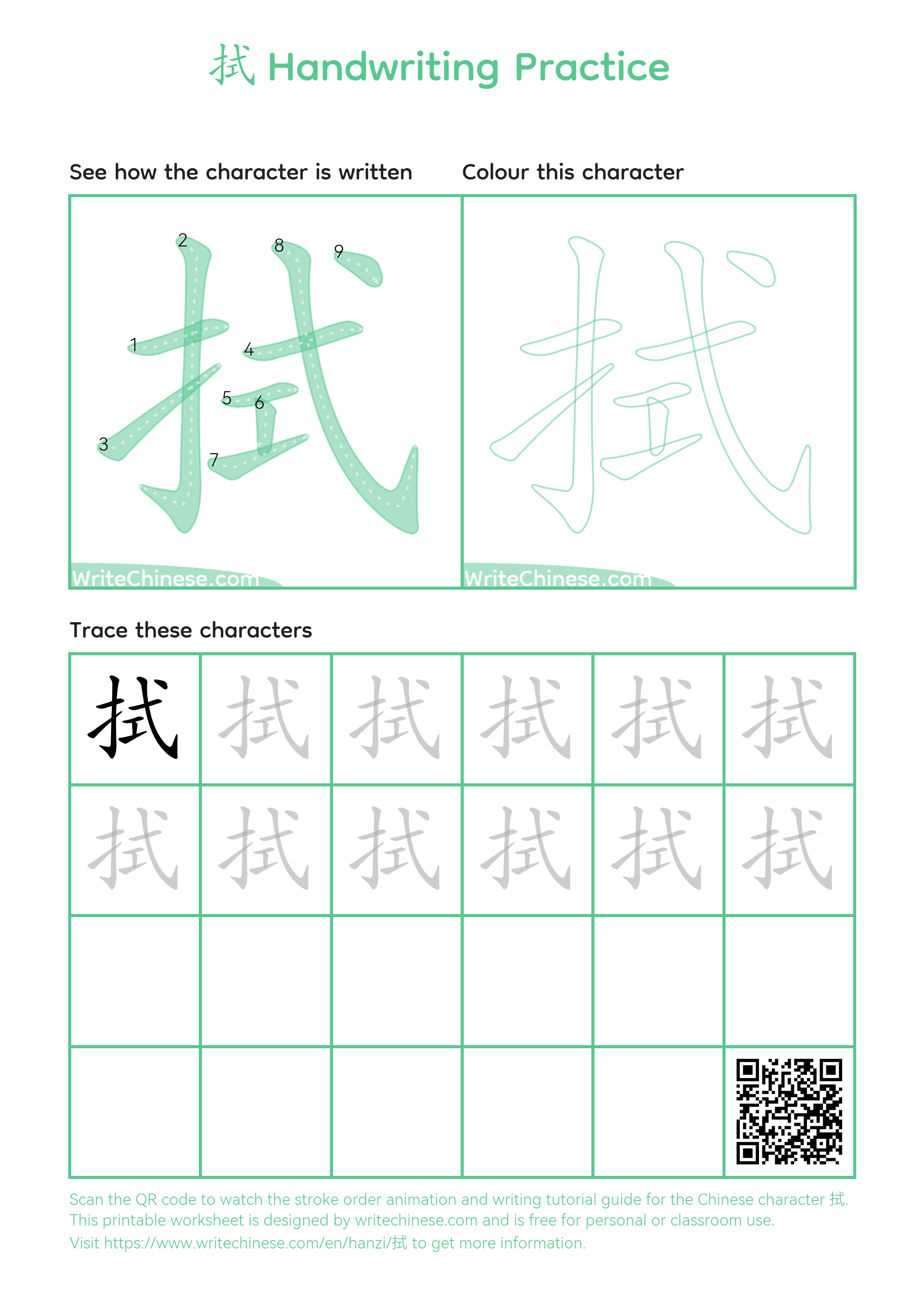 Learn the proper way to write the Chinese character '拭' through a video tutorial with a calligraphy teacher. Follow the Calligraphy Master's Step-by-Step Guide to Write the Chinese Character '拭'. You can download the printable handwriting worksheets below and practice writing together with pen and paper.