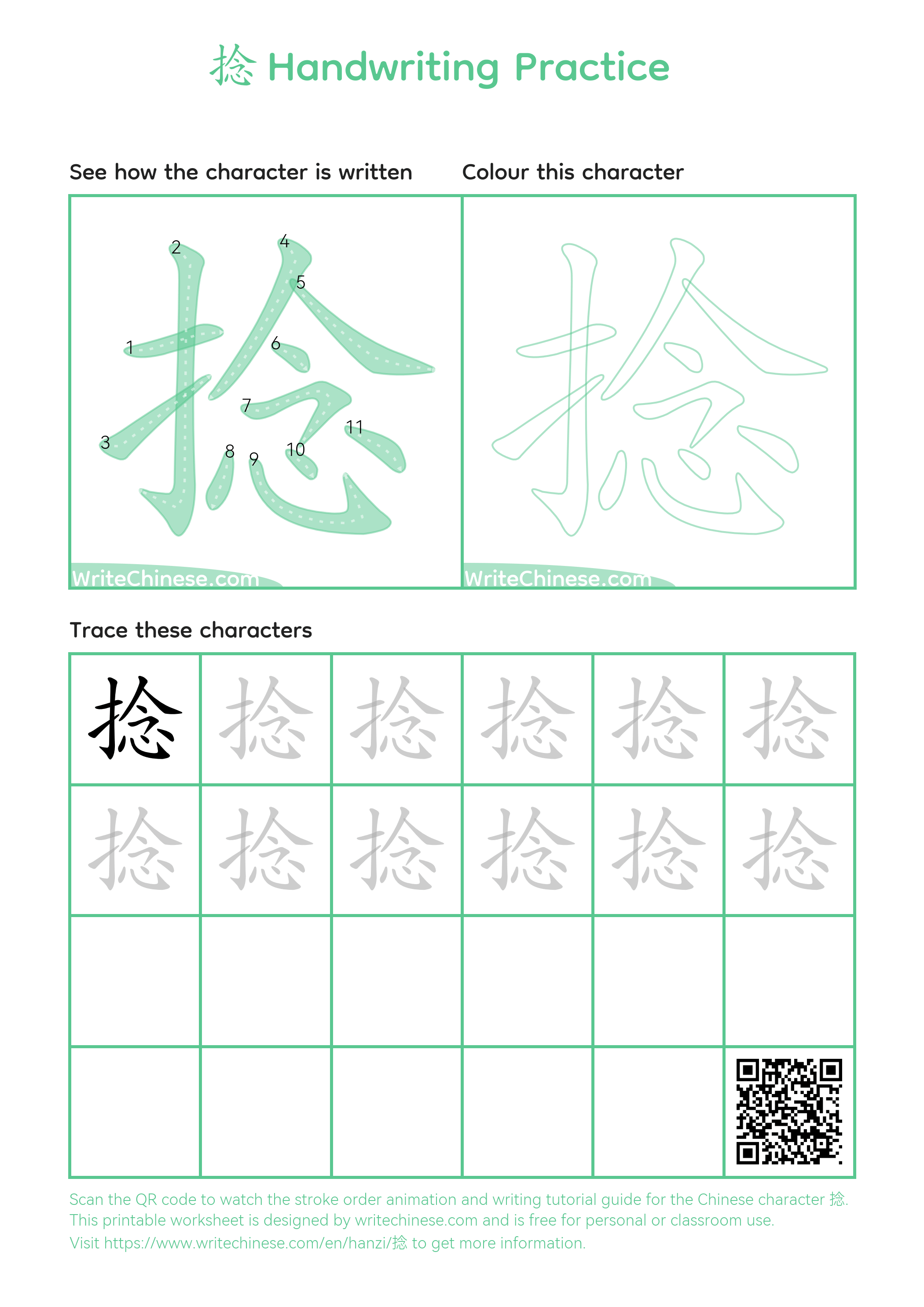 Chinese Character '捻'. You can download the printable handwriting worksheets below and