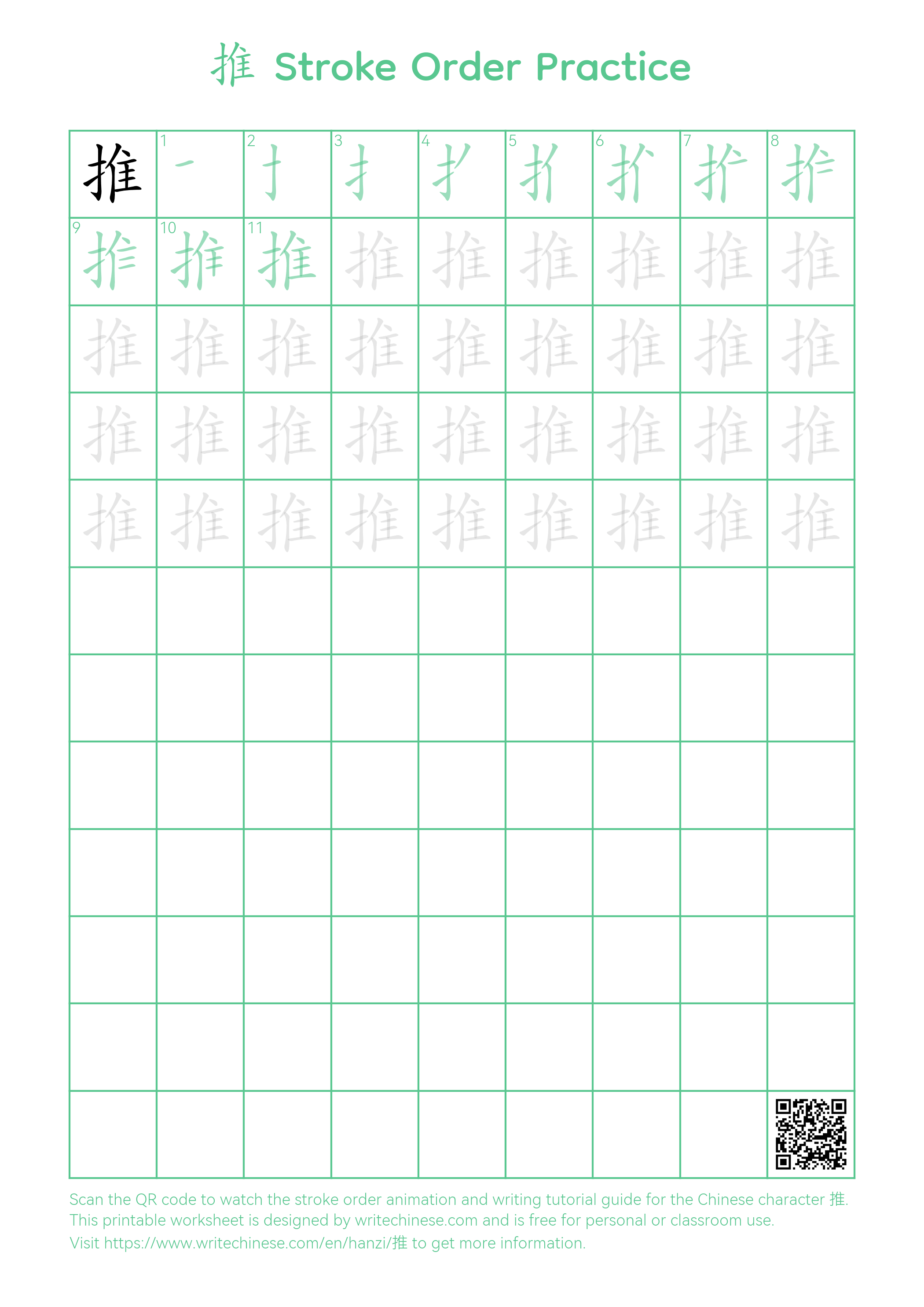 Chinese Character '推'. You can download the printable handwriting worksheets below and