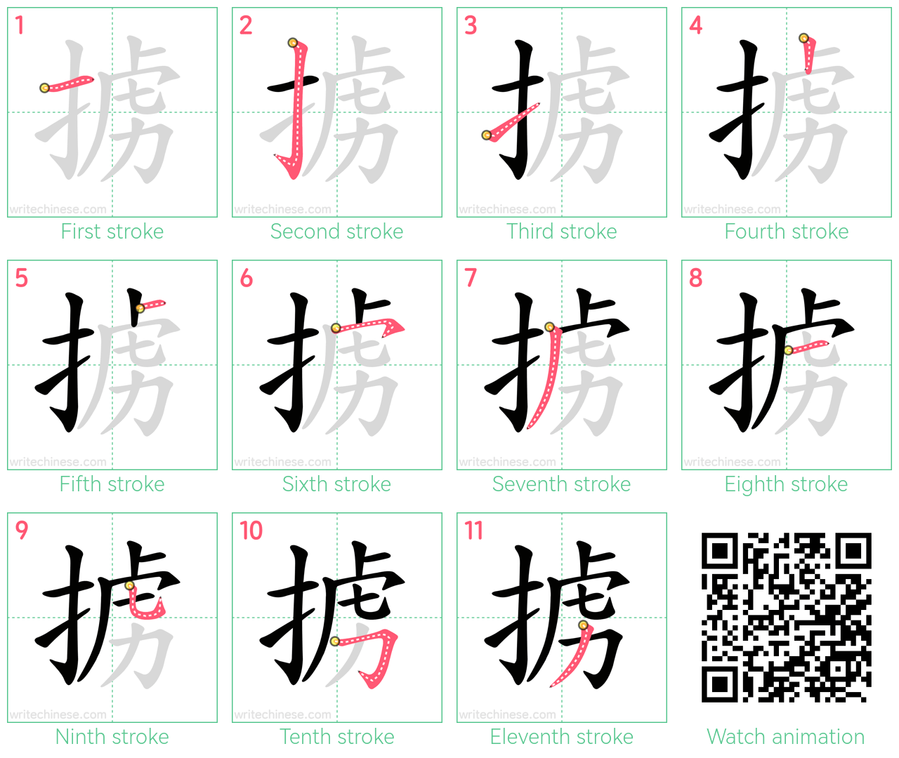 Master the Chinese character '掳' stroke by stroke with visual step-by-step instructions.