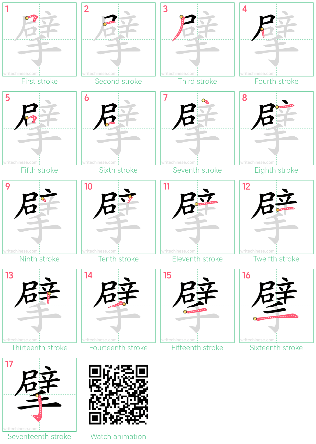 Master the Chinese character '擘' stroke by stroke with visual step-by-step instructions.