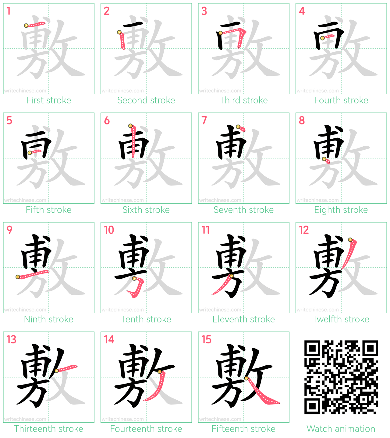 Master the Chinese character '敷' stroke by stroke with visual step-by-step instructions.