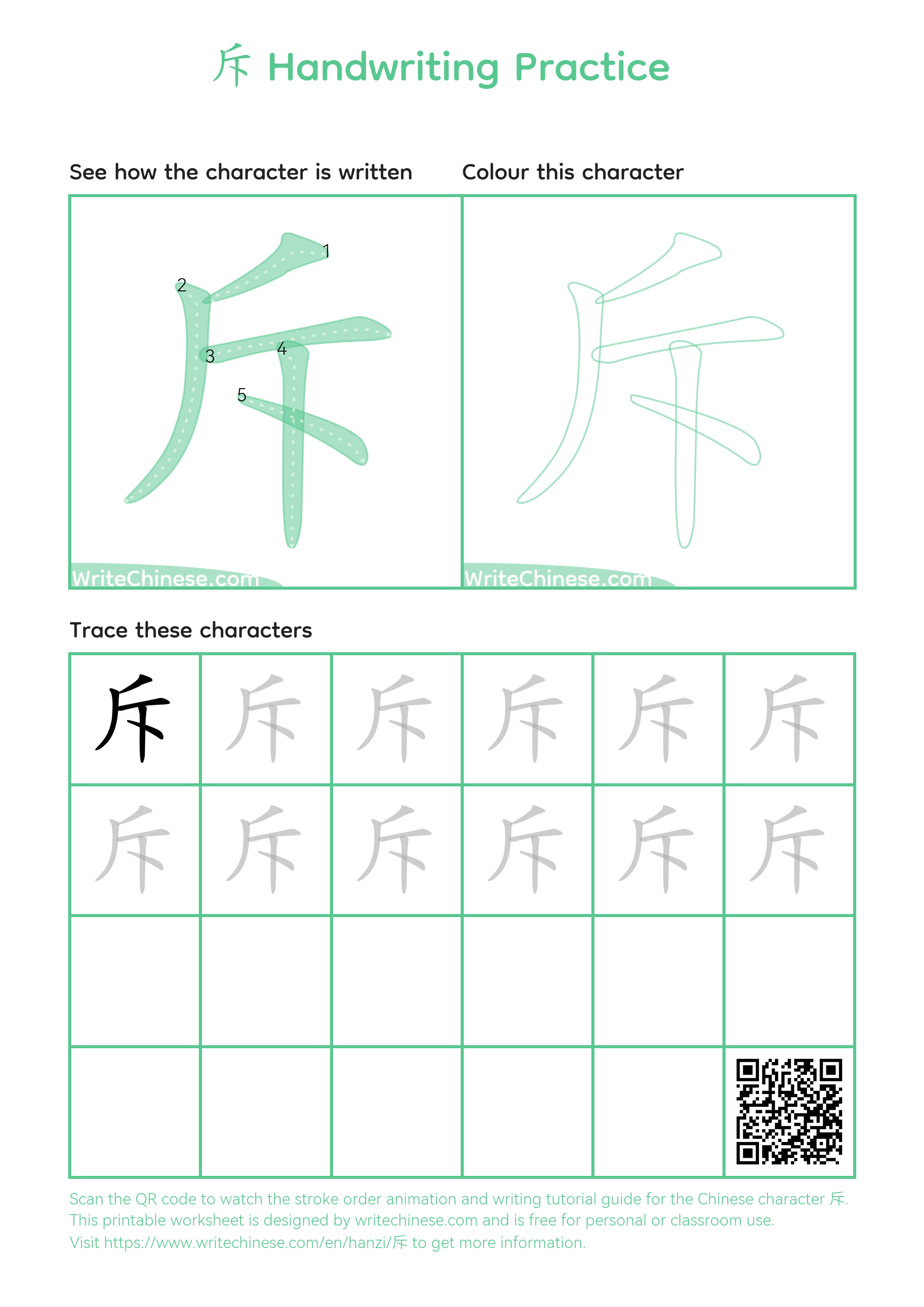 Chinese Character '斥'. You can download the printable handwriting worksheets below and