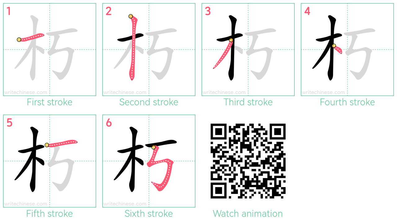 Learn to write the Chinese character "朽" by watching the stroke order animation of "朽".