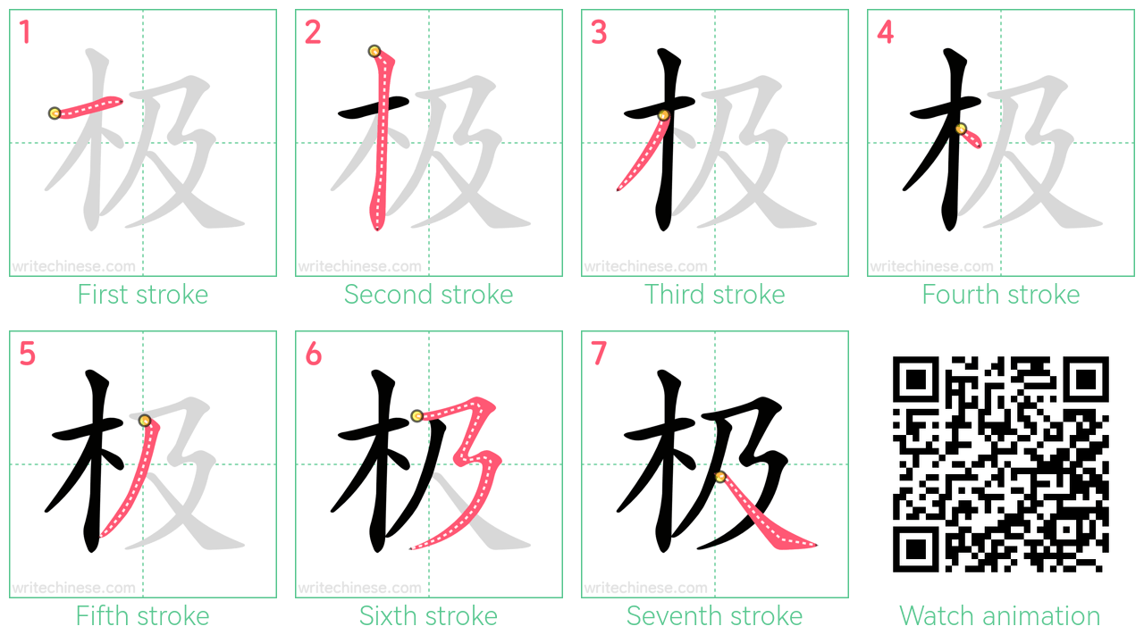 Master the Chinese character '极' stroke by stroke with visual step-by-step instructions.