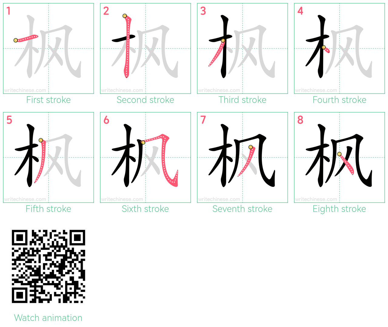 Learn to write the Chinese character "枫" by watching the stroke order animation of "枫".