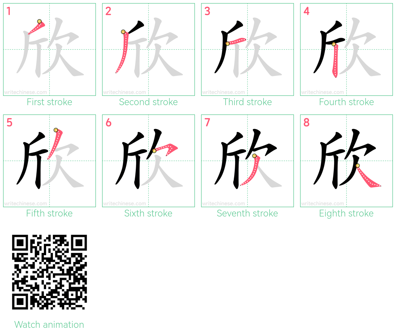 Learn to write the Chinese character "欣" by watching the stroke order animation of "欣".