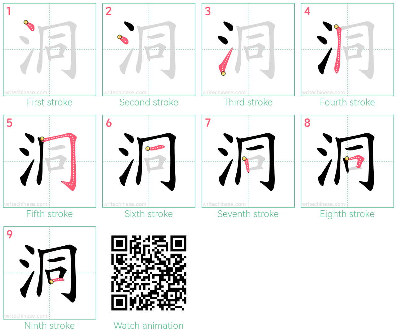 Master the Chinese character '洞' stroke by stroke with visual step-by-step instructions.