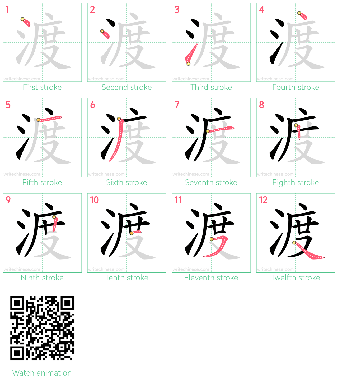 Master the Chinese character '渡' stroke by stroke with visual step-by-step instructions.